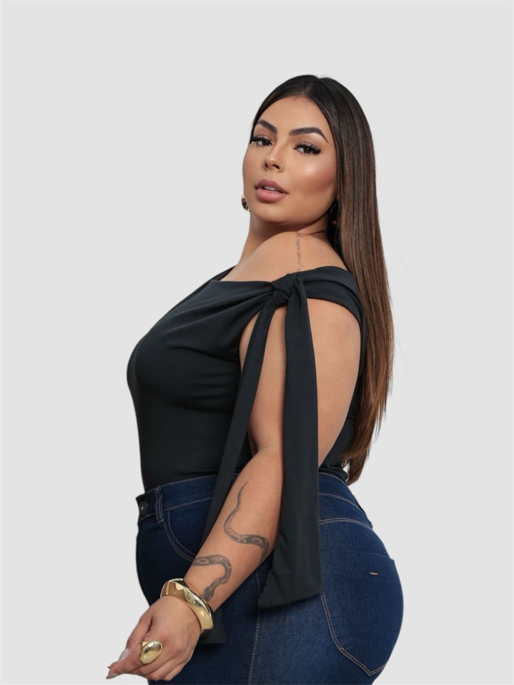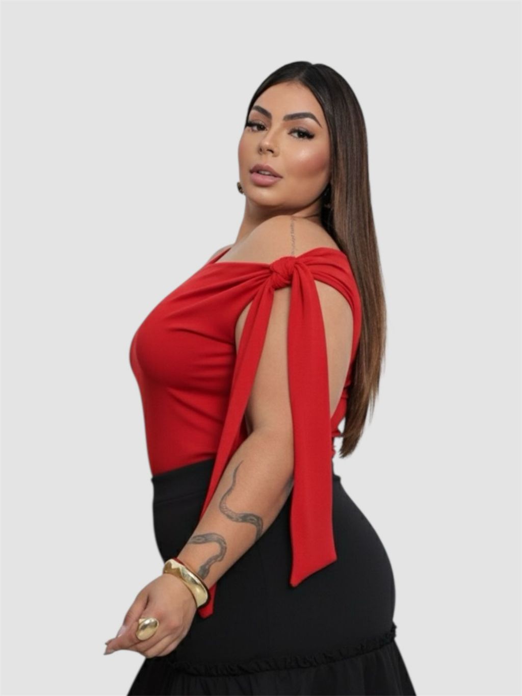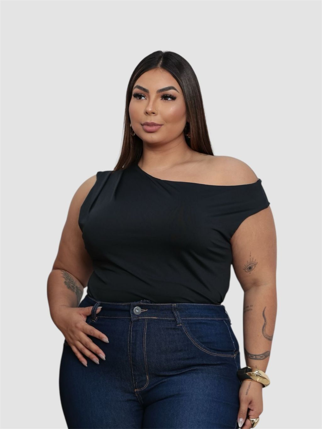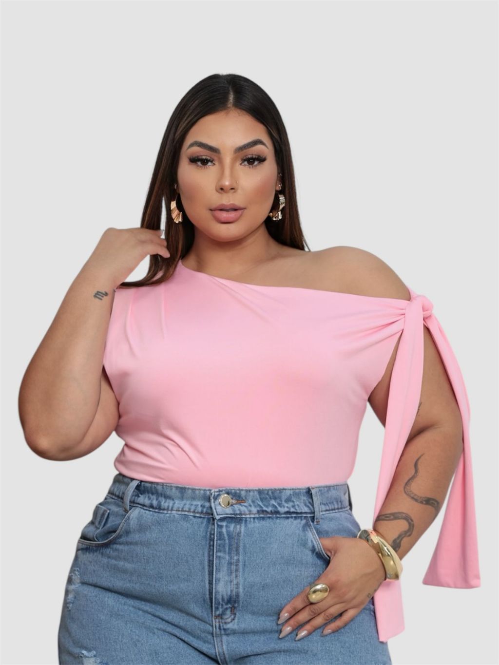 Blusa Feminina Assimétrica Decote Canoa Plus Size Suplex 2 Em 1 Com Laço Removível
