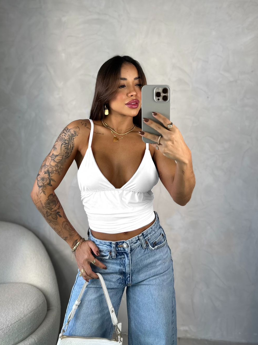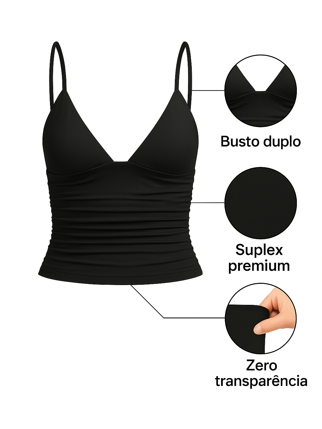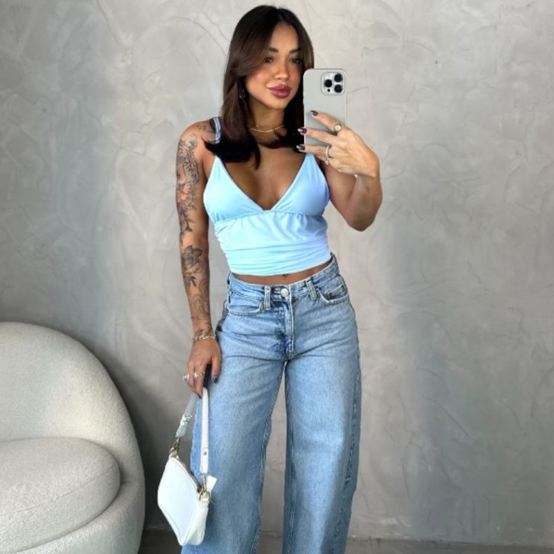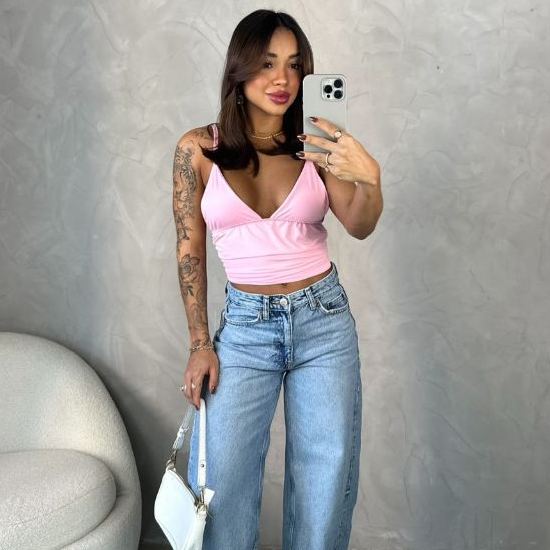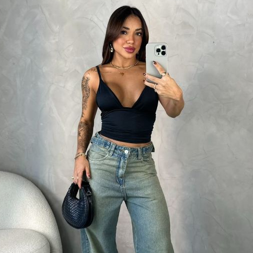 Blusa Feminina Camiseta Básica Slim com Decote em V - Regata Alça Efeito Silicone Moda Gringa Style