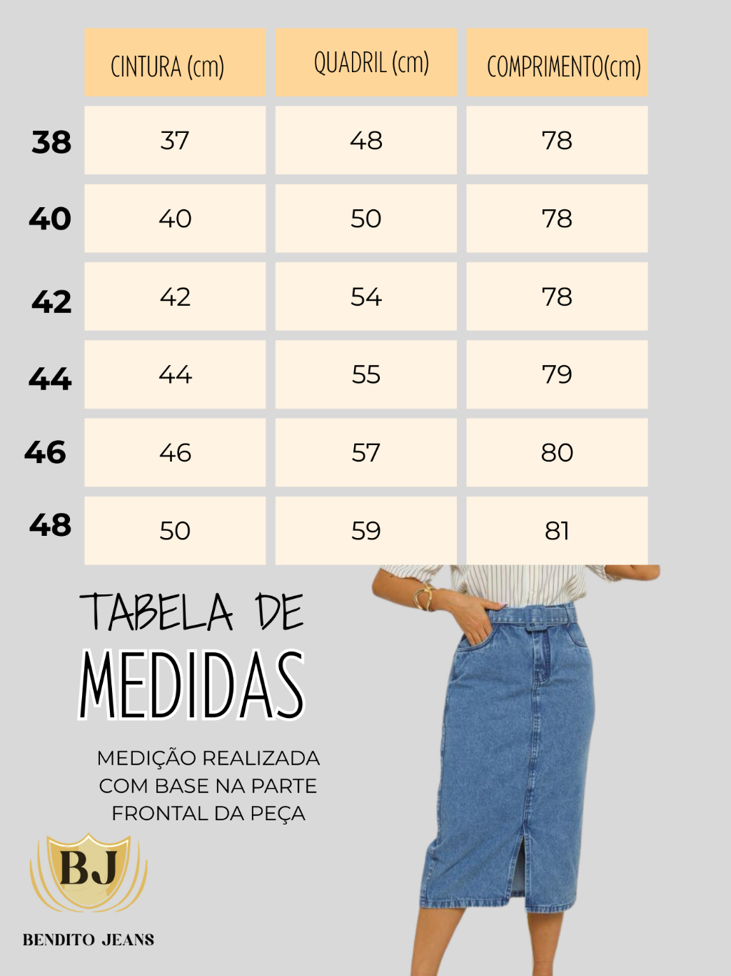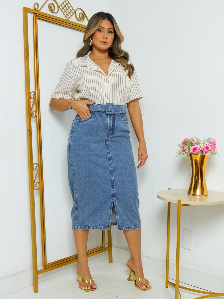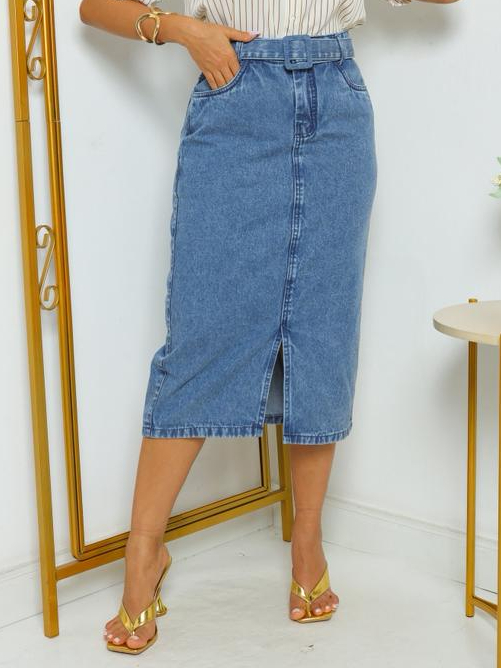 Saia Jeans Midi 100% Algodão com Fenda na Frente, Bolso e Cinto, sem Lycra