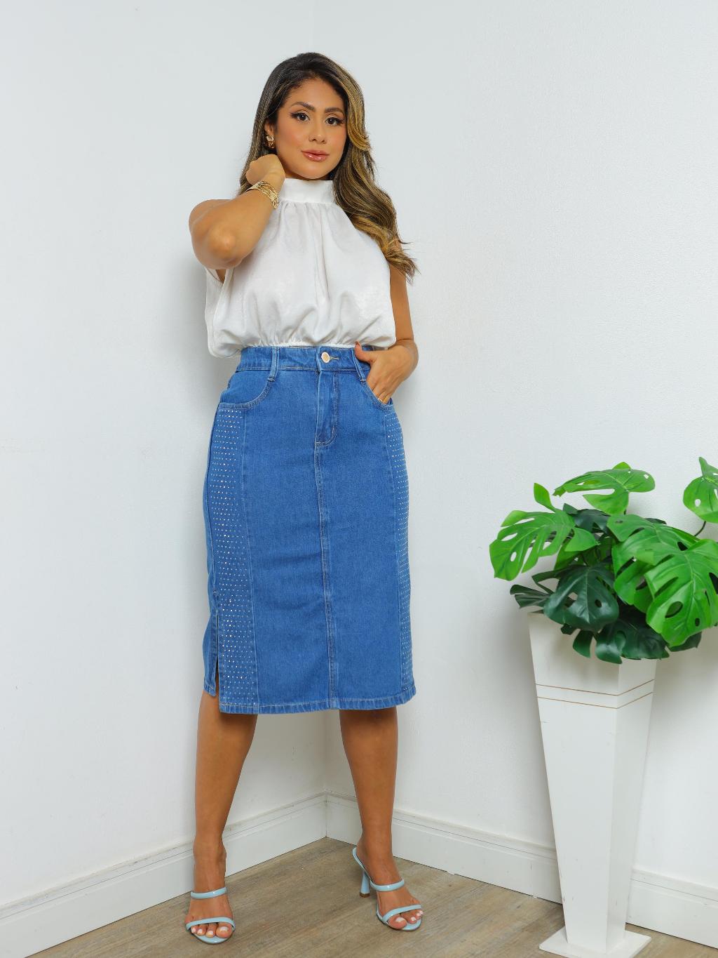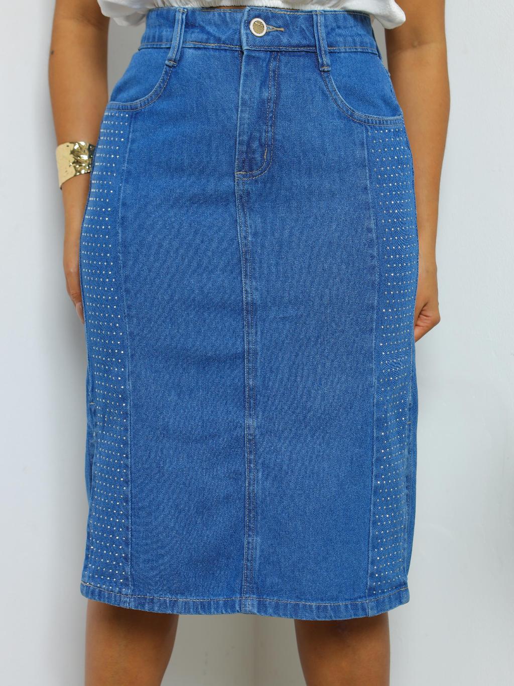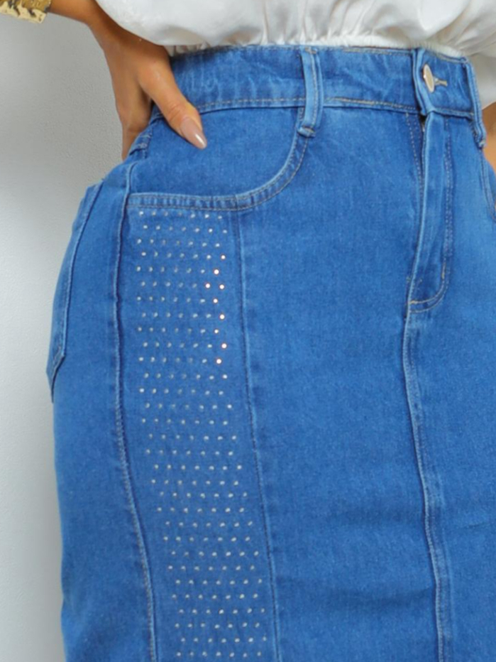 Saia Jeans Midi 100% Algodão com Brilho de Strass e Fenda na Lateral Sem Lycra