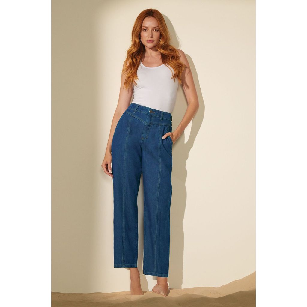 Calça Feminina Reta Jeans Recortes Marialícia Azul