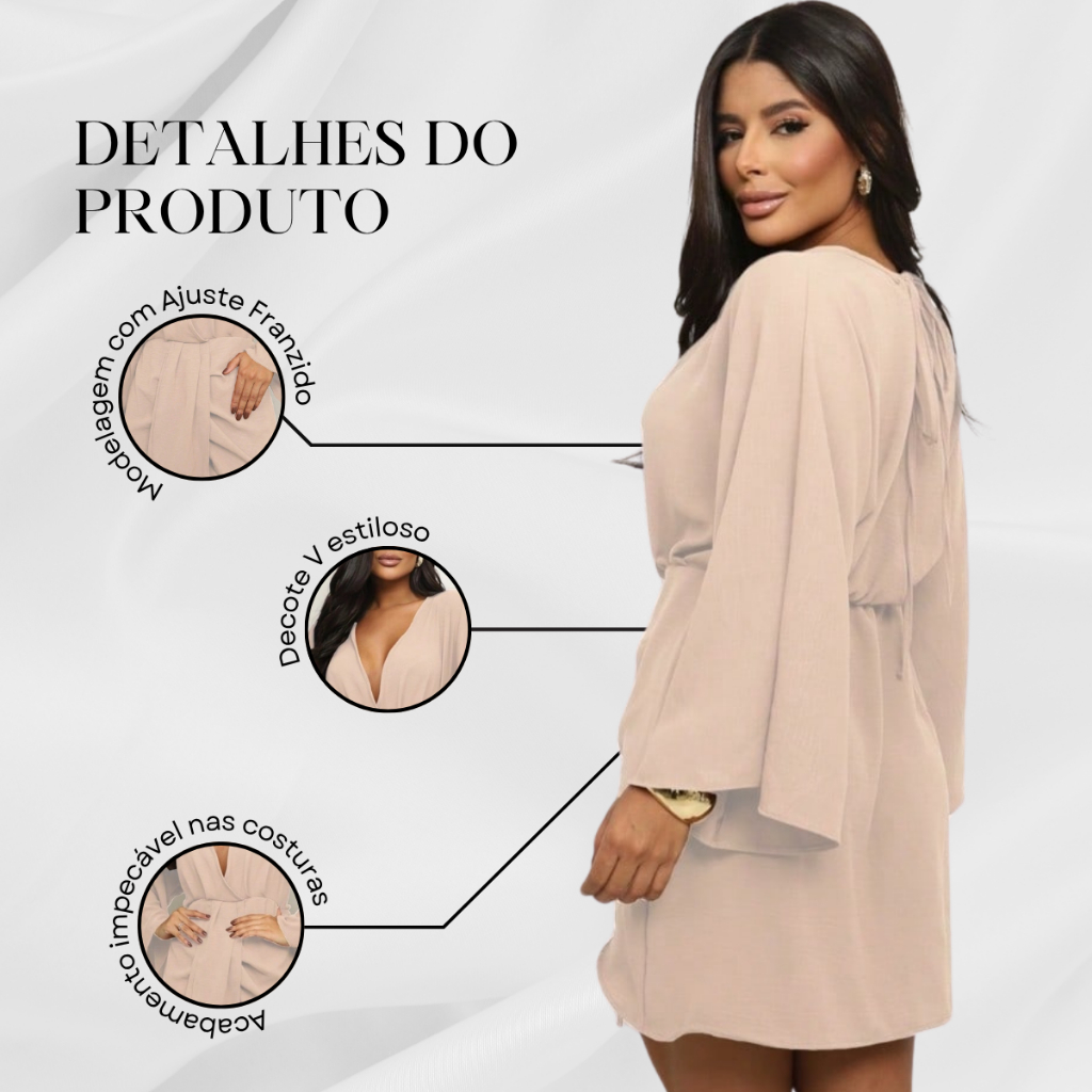 Vestido Curto Feminino Manga Longa Flare Decote V Soltinho Casual Elegante Inverno Moda Gringa