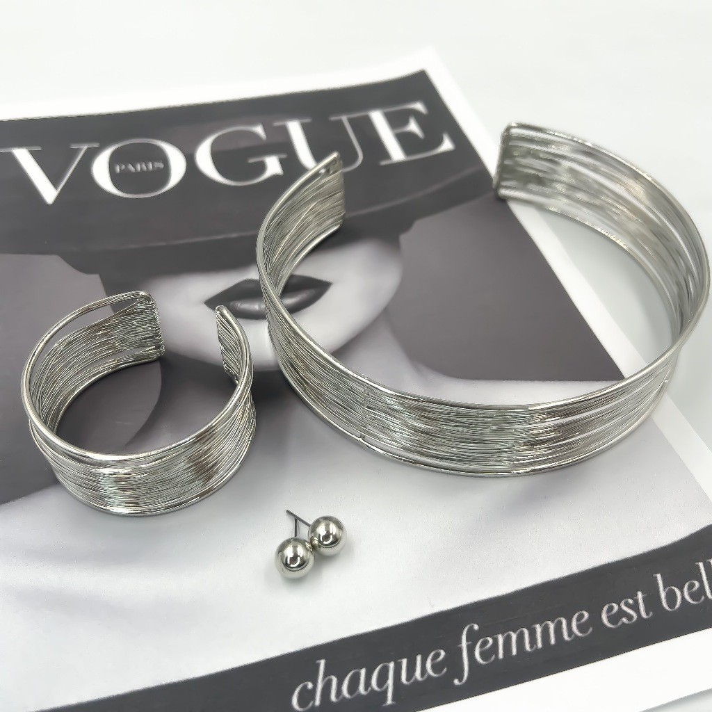 Kit Choker Aro Fios Grosso Chic Bracelete e Brinco Ouro Prata