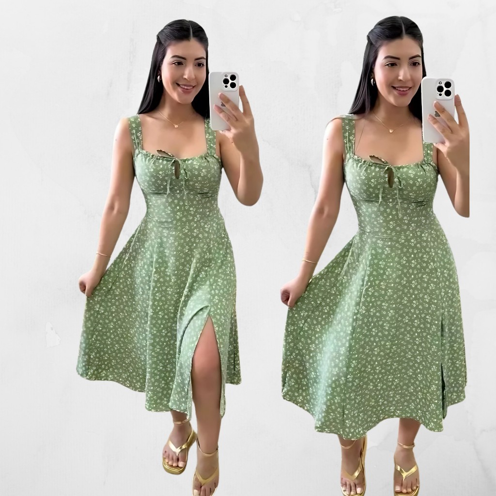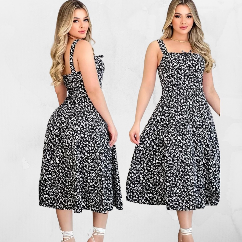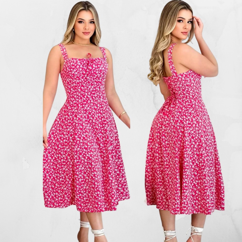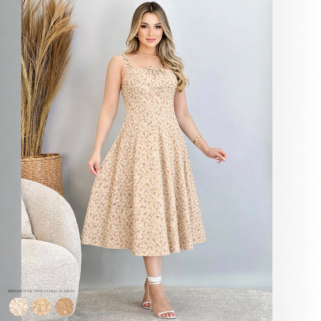 VESTIDO MIDI ROMANTICO ESTAMPADO FLORAL COM ALÇA E ELASTEX CRUZADO, TENDENCIA 2025