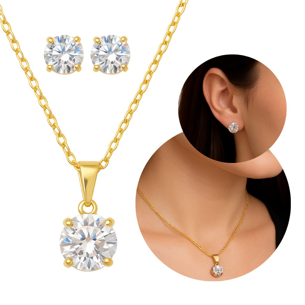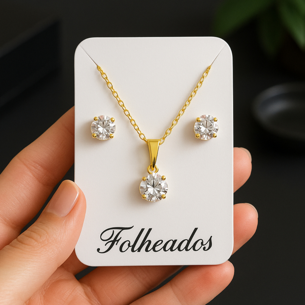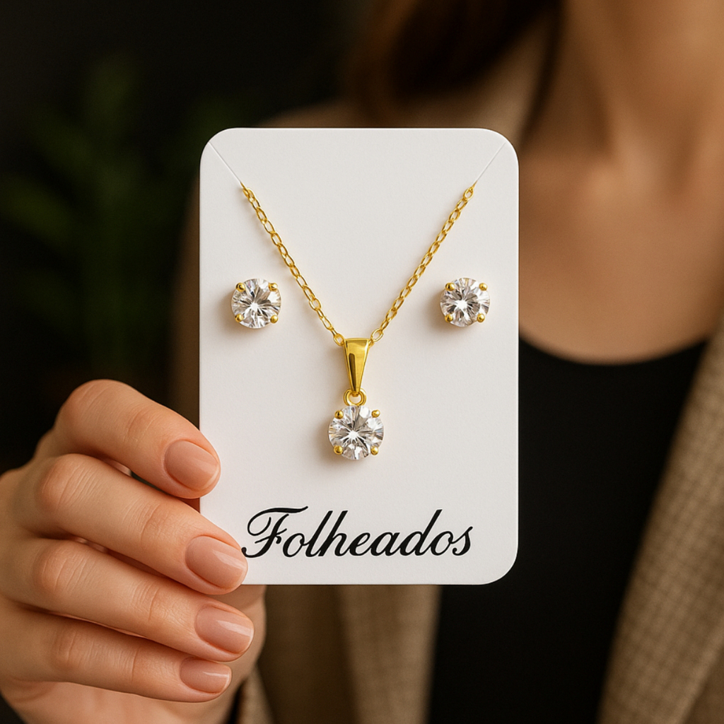 Conjunto Colar e Brinco Ponto de Luz Folheado a Ouro Feminino Pedra Brilhante