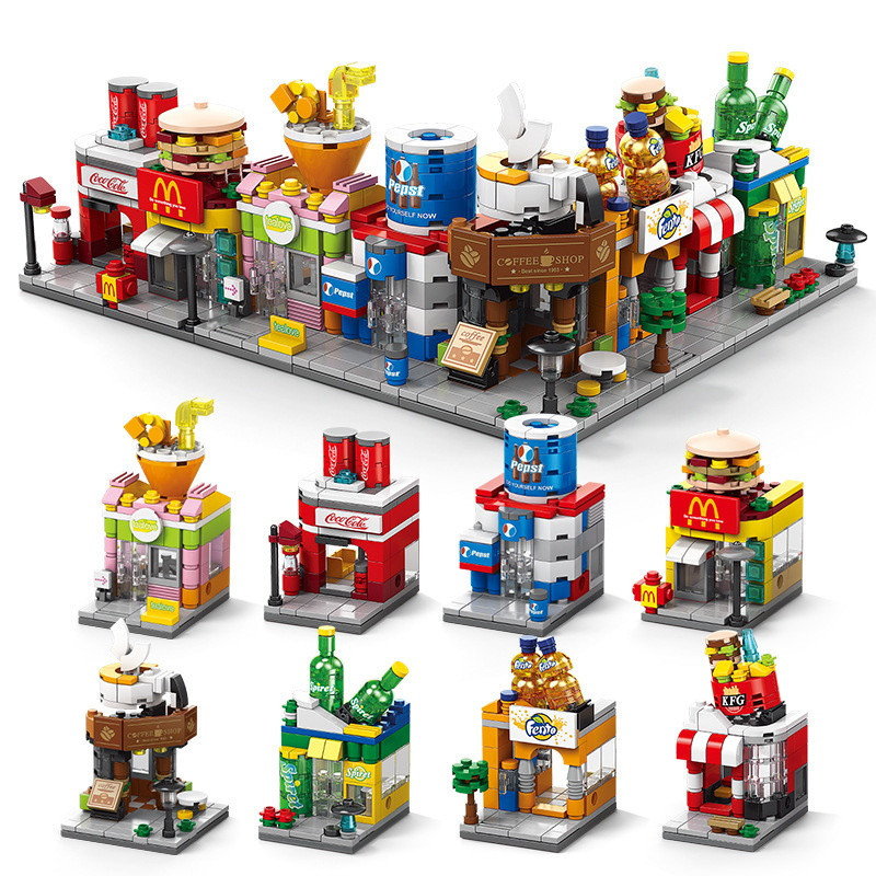 16 Mini Street View City Fast Food Beverages Bebidas Comerciais Street DIY Presentes Educacionais de Montagem de Brinquedos