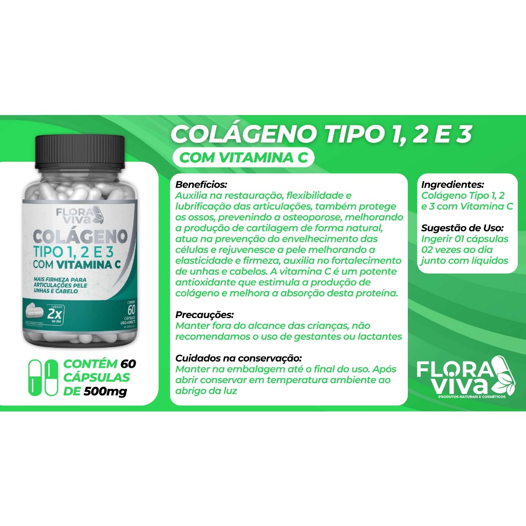 4 POTES Colágeno Tipo 1, 2 e 3 com Vitamina C 60cps - Flora Viva
