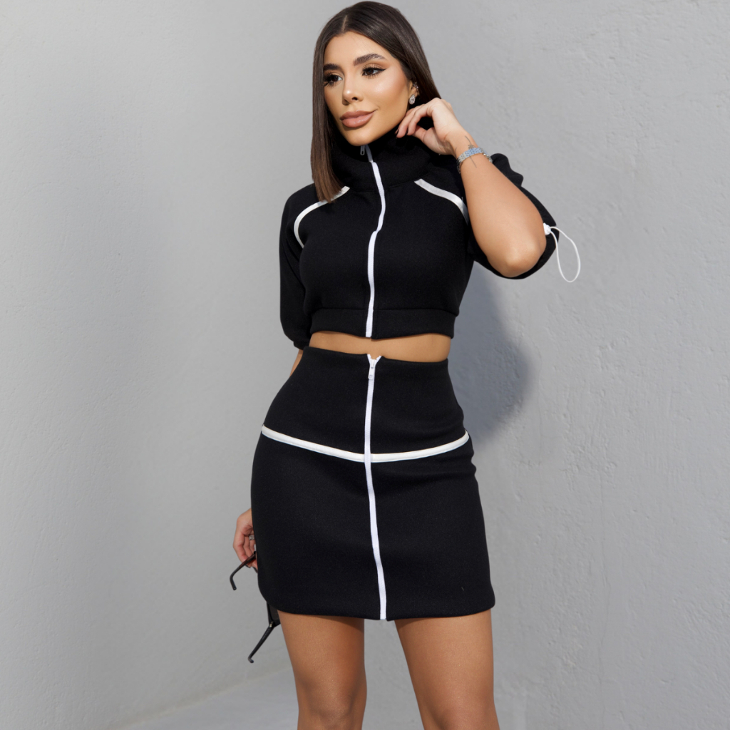 Conjunto Feminino Cropeed Raglã Gola Alta com Ziper Saia Fecho Frontal