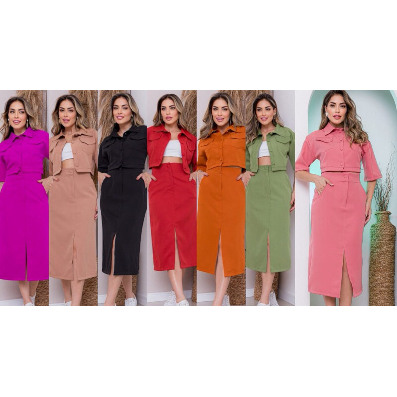 Conjunto de saia com fenda e blusa alfaiataria usa aberto ou fechado