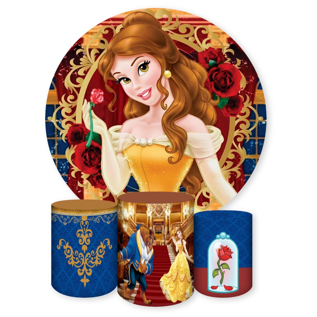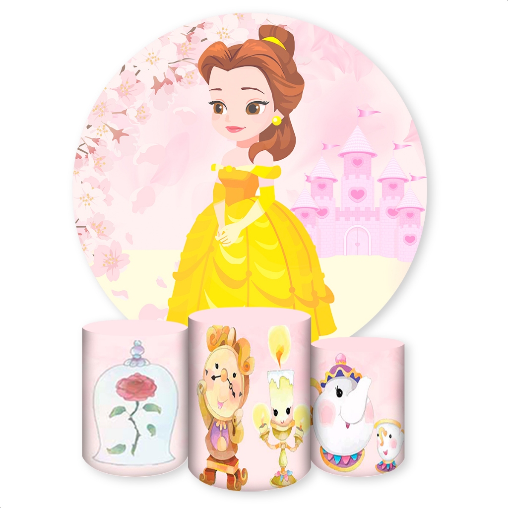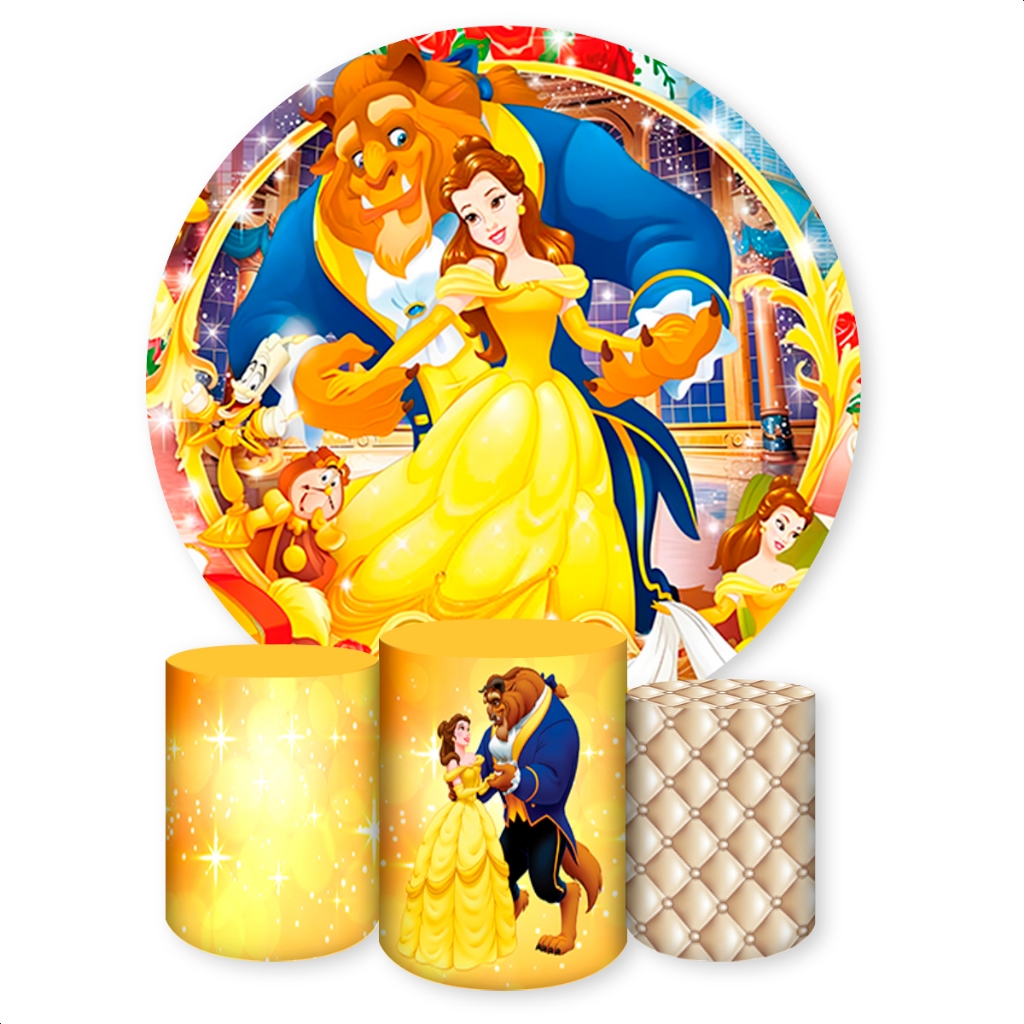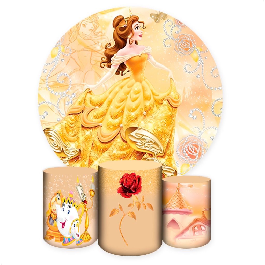 Kit Capa Painel Redondo + Capas Cilindros Sublimados Para Festas Tema A Bela e a Fera