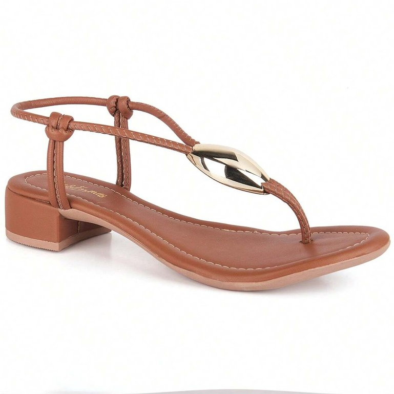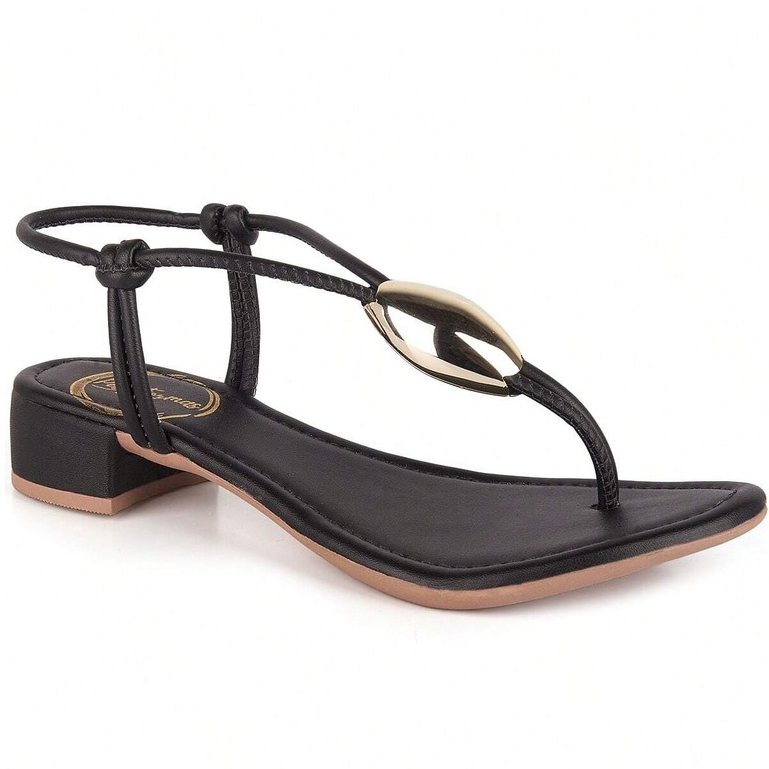 Sandália Salto Baixo Feminina Enfeite de Metal Folha Dourada Casual e Confortável Dia a Dia Lesma