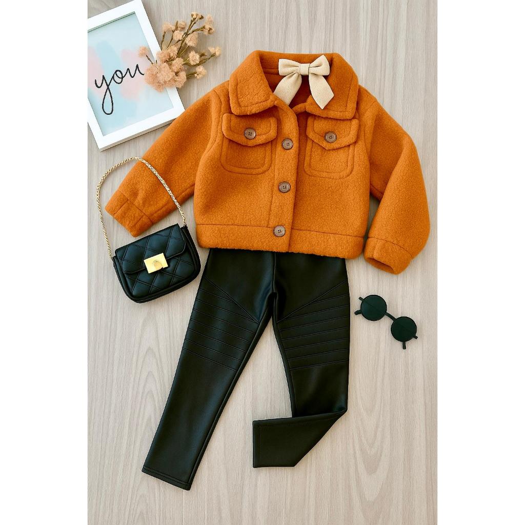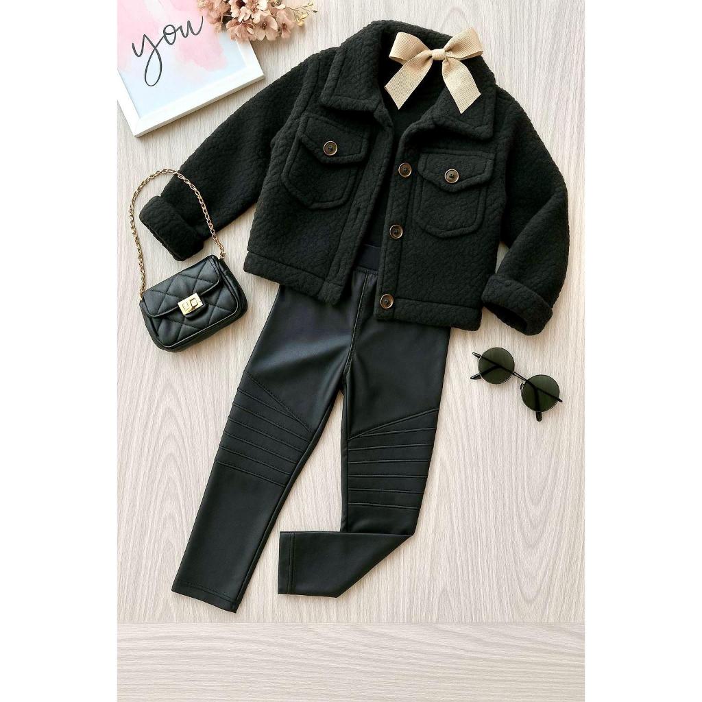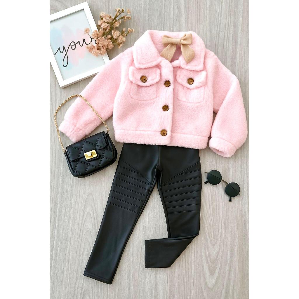 Conjunto Infantil Casaco Teddy Cropped + Calça Tratorada Estilo Blogueirinha Blusa De Frio Menina Quente Inverno Pelúcia