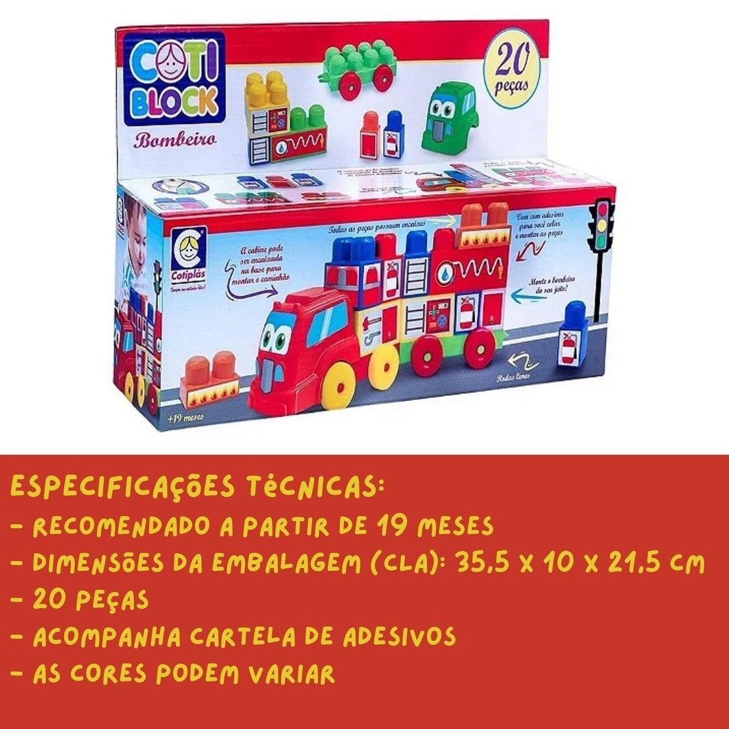 Brinquedo de Montar Coti Bloco Caminhão de Bombeiro Cor Sortida 20 Peças para Crianças +19 Meses Cotiplás - 2355