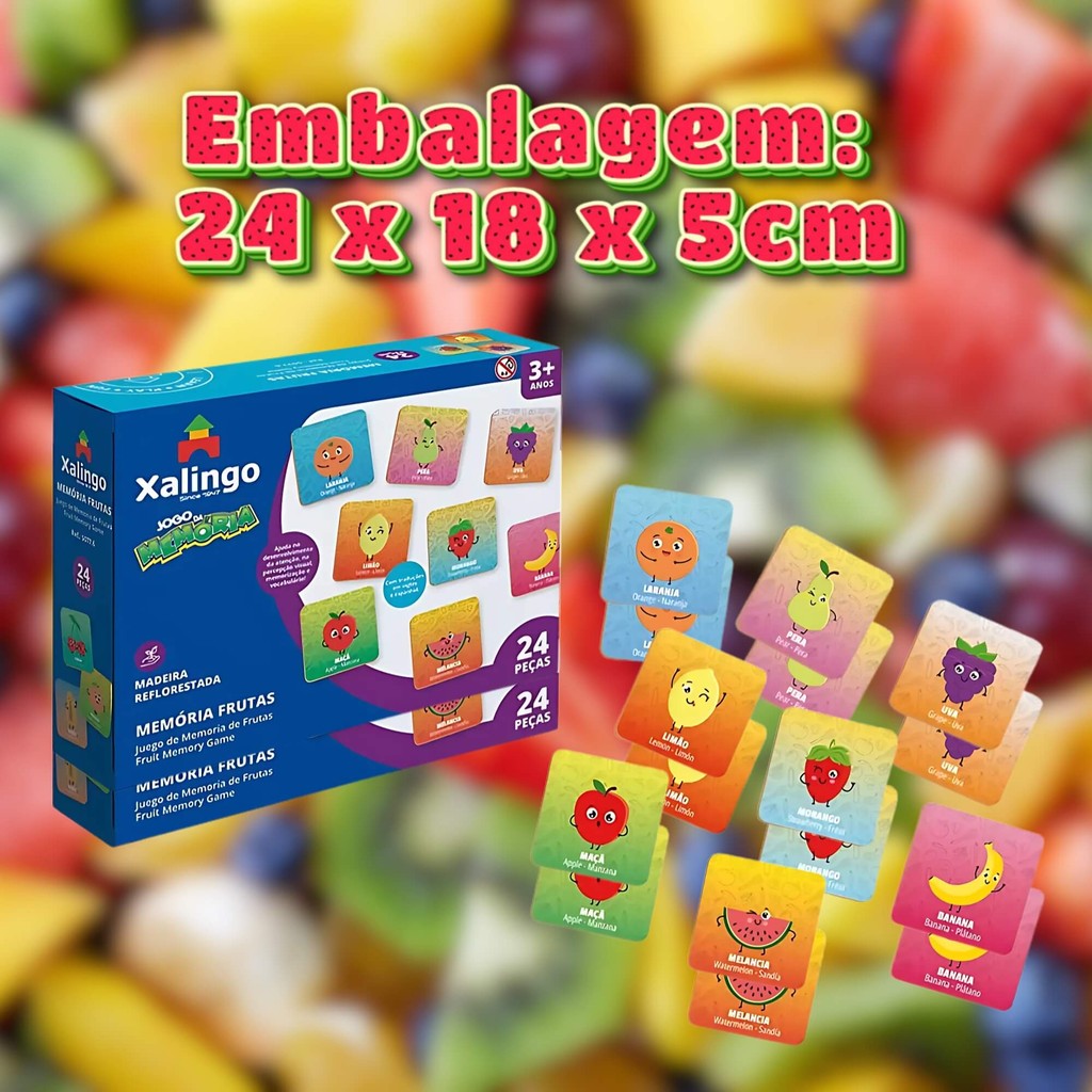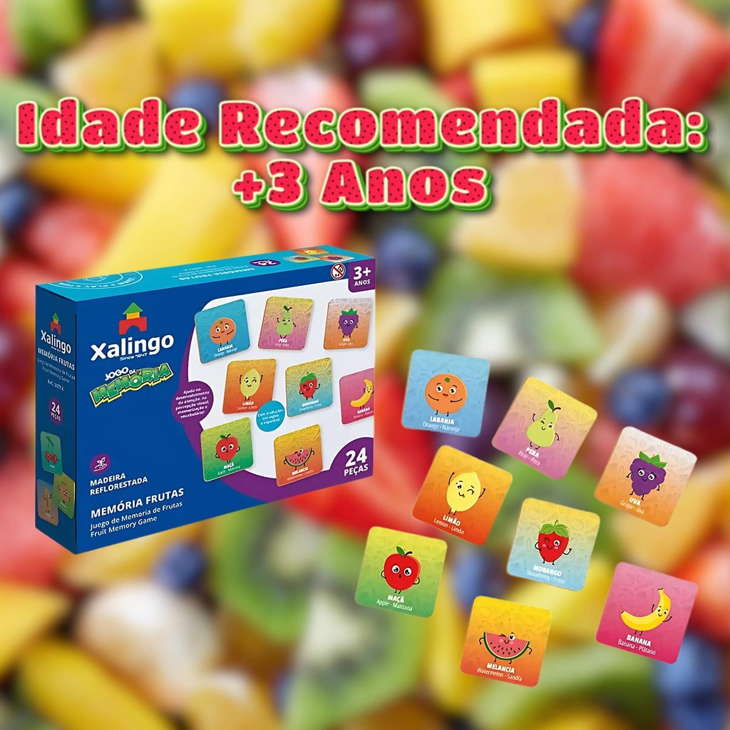 Jogo da Memória Frutas Infantil A partir de 3 Anos 24 Peças Madeira Brinquedo Educativo Xalingo - 50776