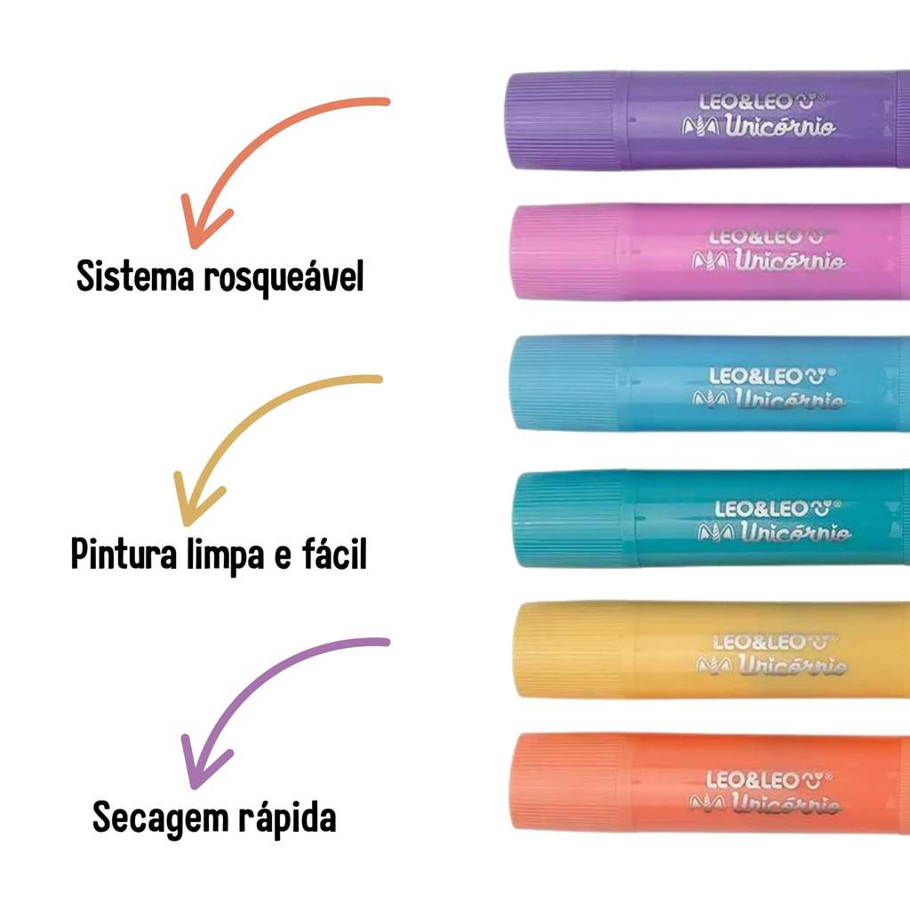 Caixa Tinta Guache Bastão Cores Pastel Unicórnio 6 Cores Leo&Leo Leonora Material Escolar Papelaria