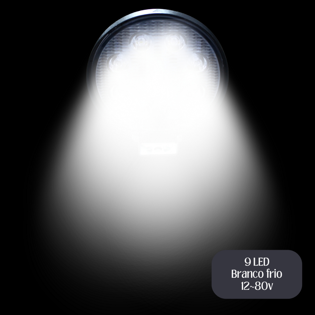 Farol Milha 12v 27w 9 led Branco frio 6500k Redondo IP66 Caminhonete Van Ônibus Caminhão Carro