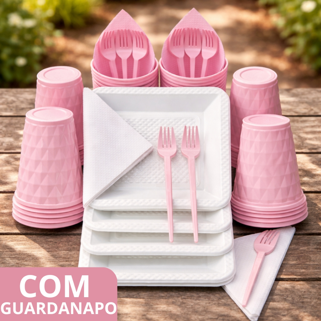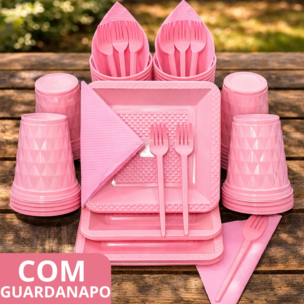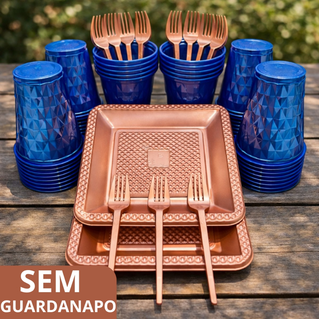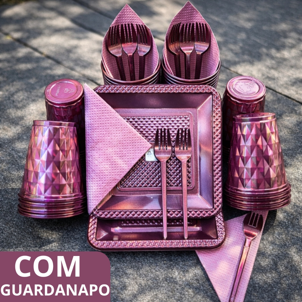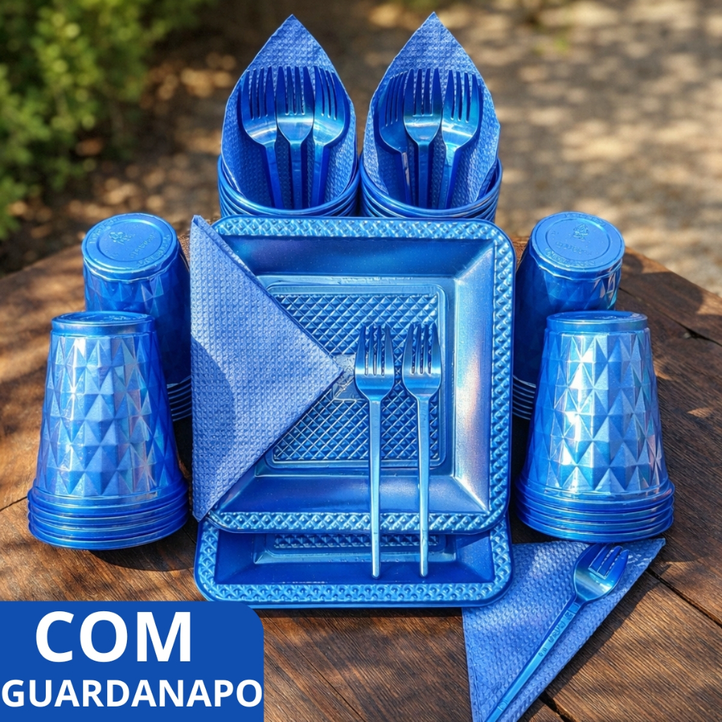 Kit 180 e 130 Itens Aniversário Descartável Diamante Quadrado Festa Pratos Copos Garfinhos Guardanapo Azul Rose Perolado