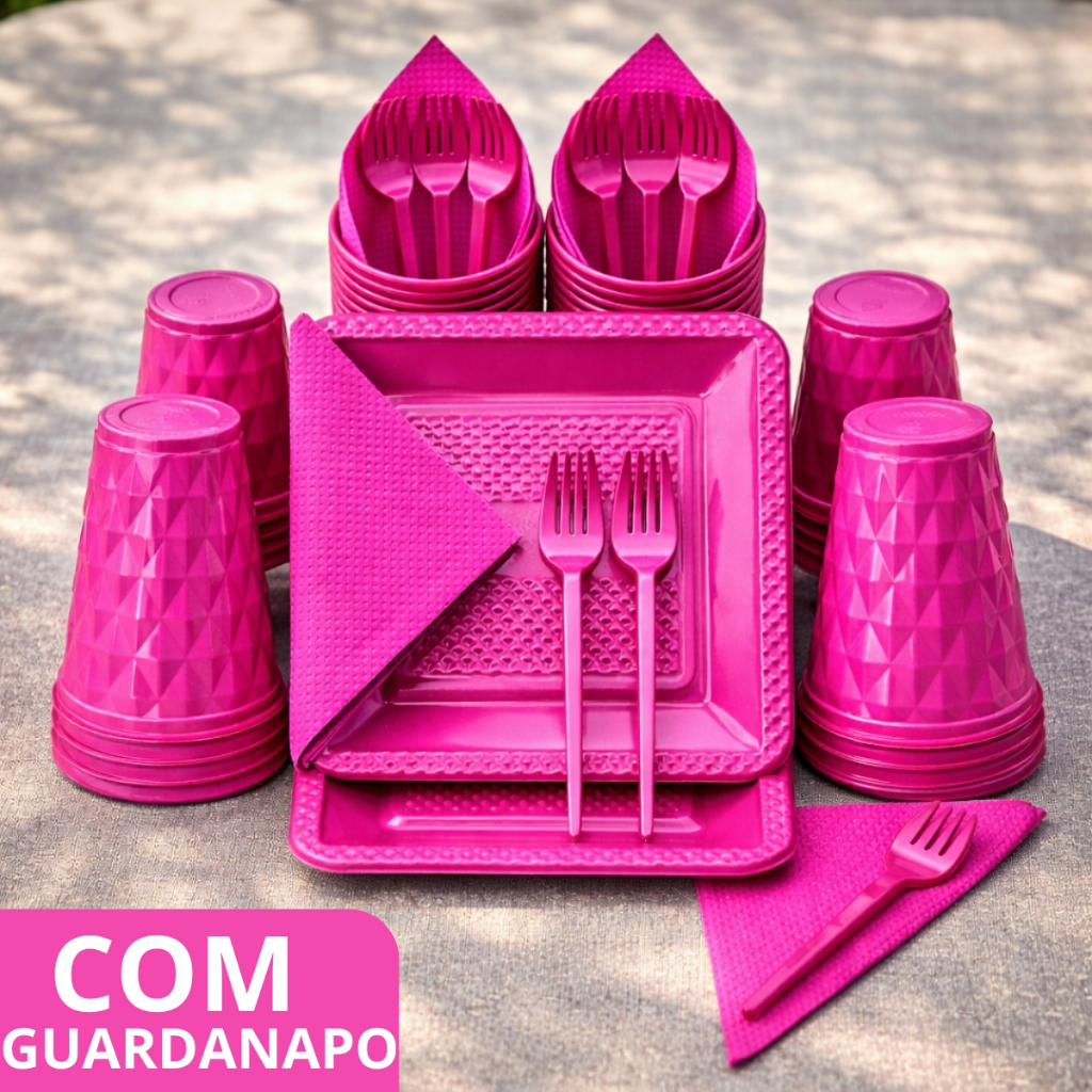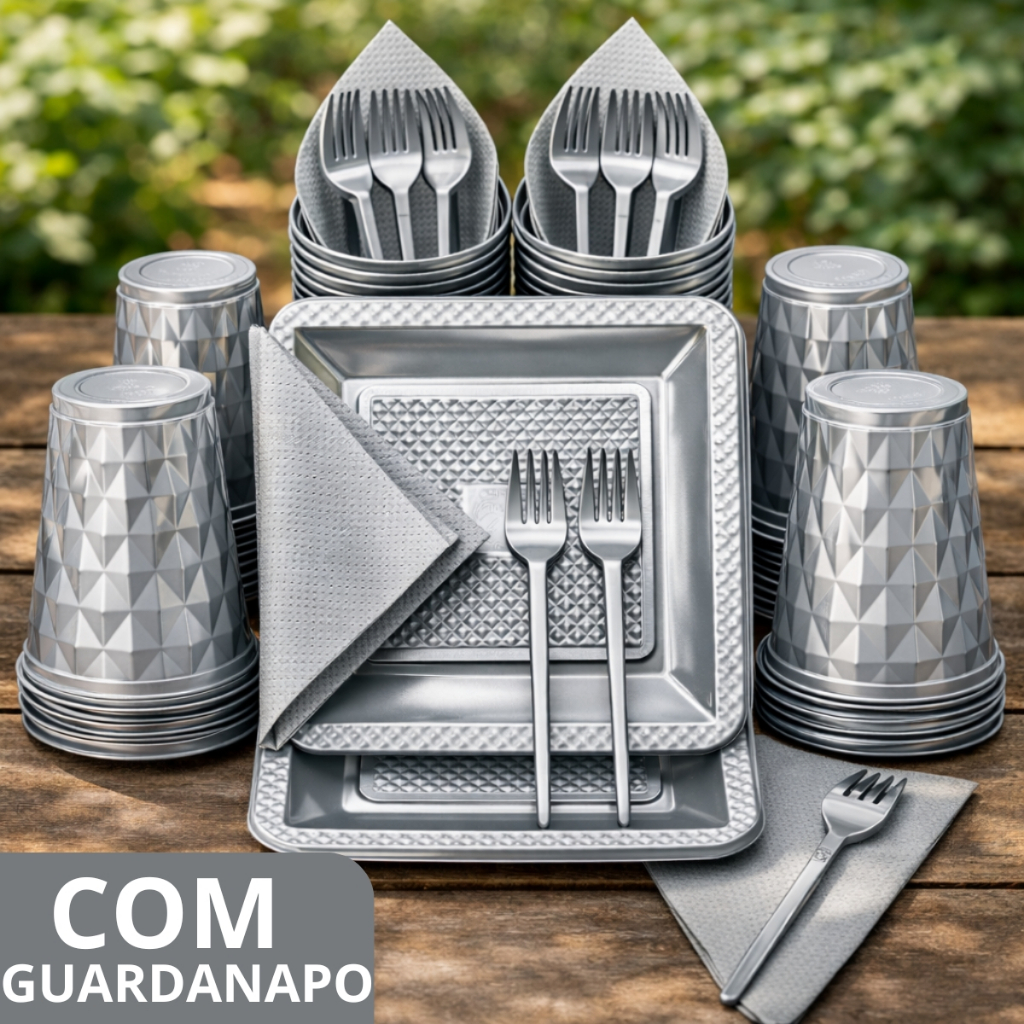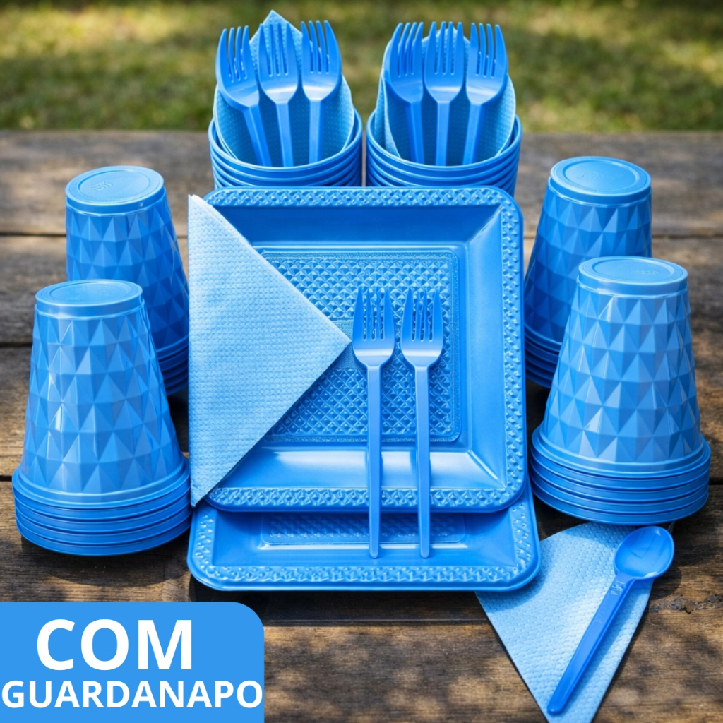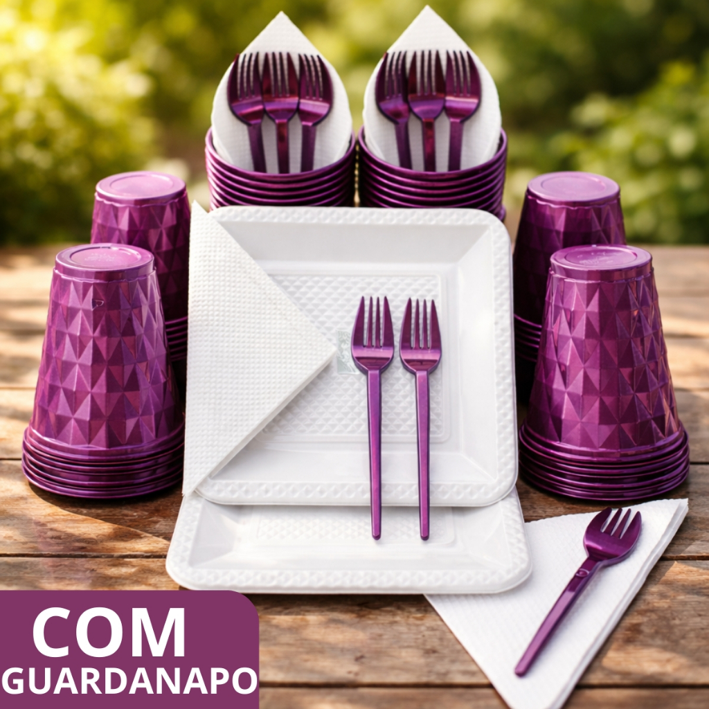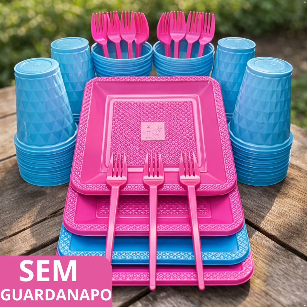 Kit 180 e 130 Itens Aniversário Descartável Diamante Quadrado Festa Pratos Copos Garfinhos Guardanapo Azul Rose Perolado