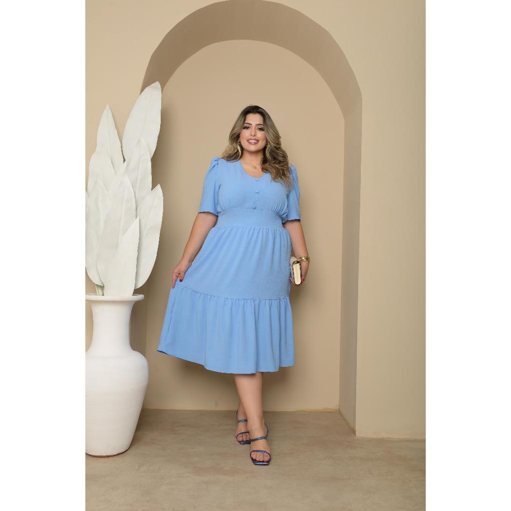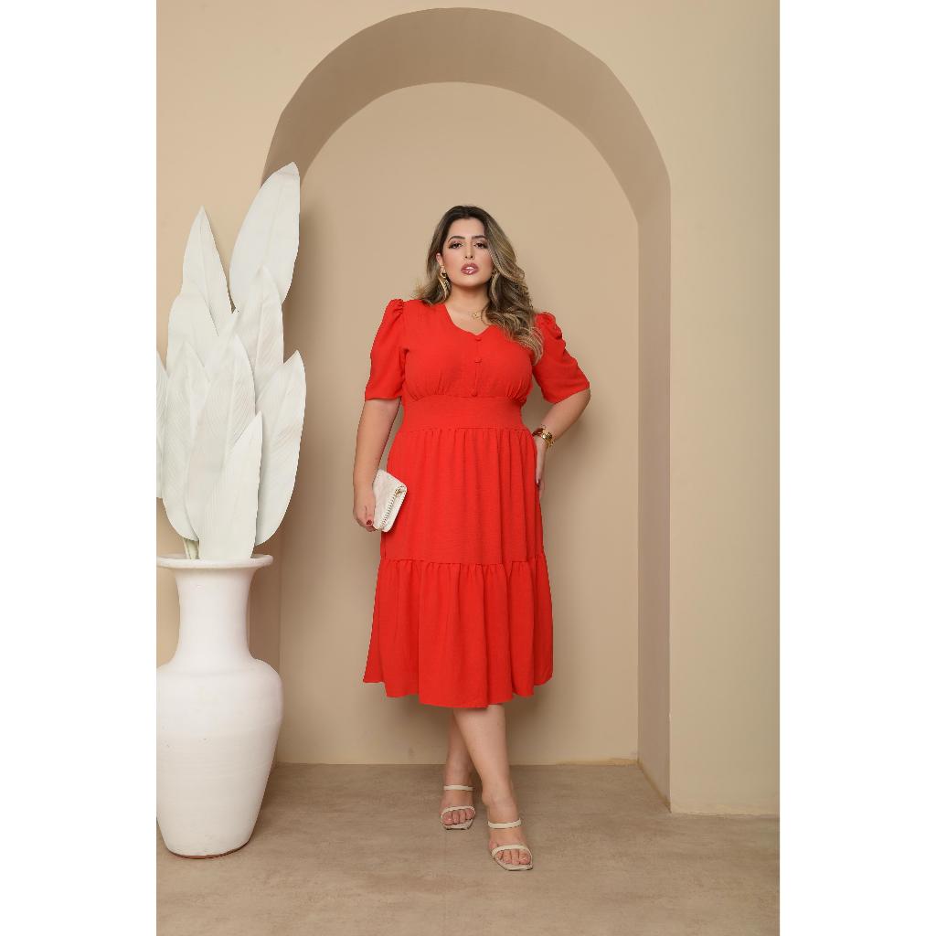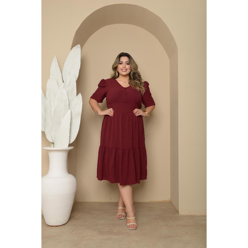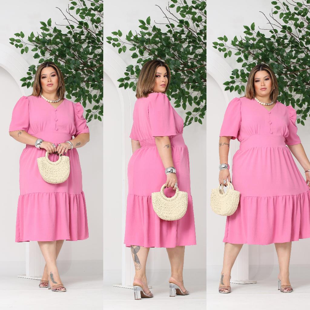 Vestido Midi Liso Feminino Plus Size Com Elastex Nas Costas