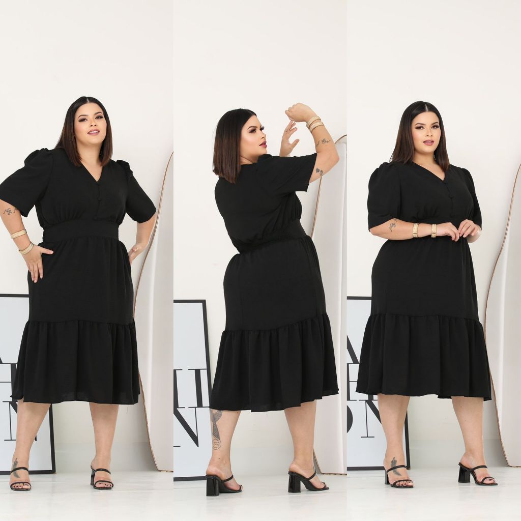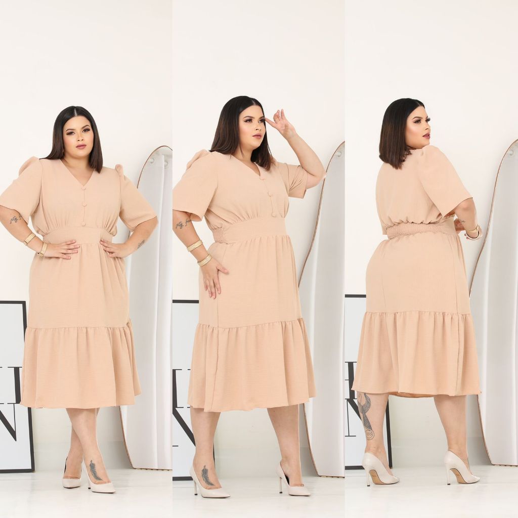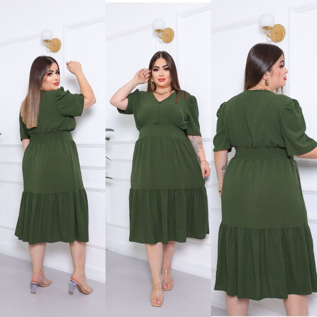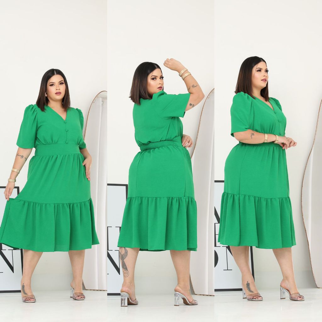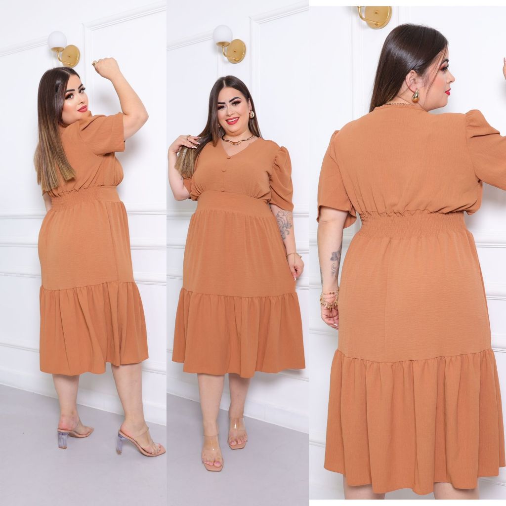 Vestido Midi Liso Feminino Plus Size Com Elastex Nas Costas