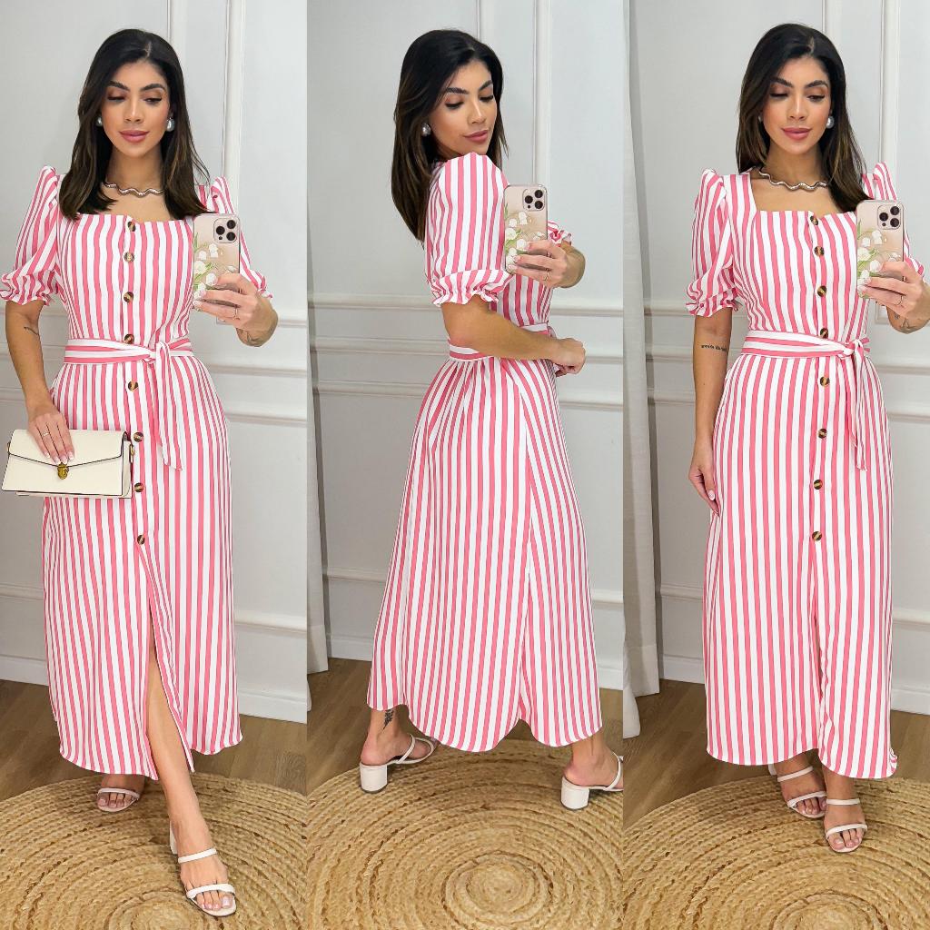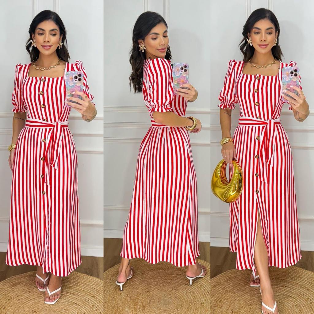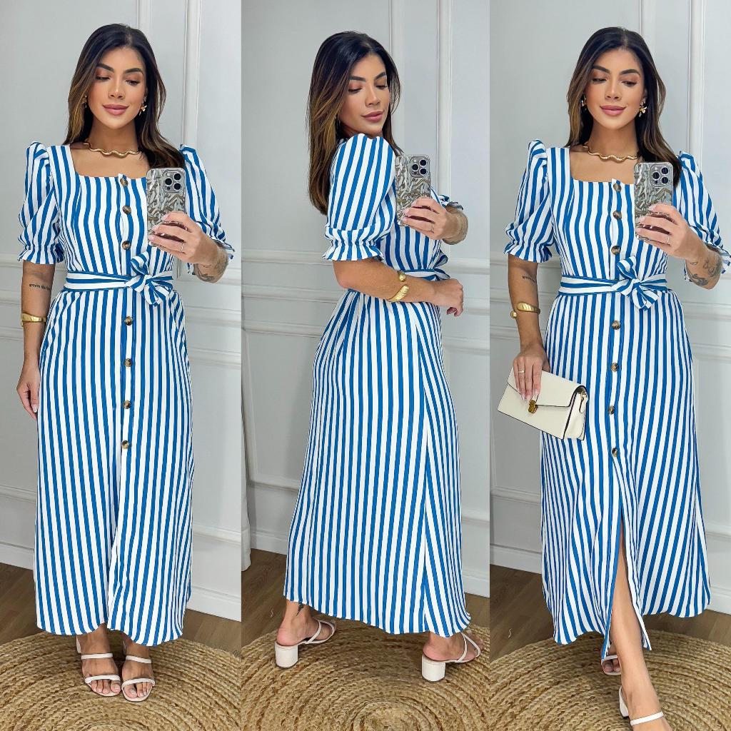 Vestido Longo Listrado com Botões e Cinto - Manga Bufante - Modelo Elegante com Elastex