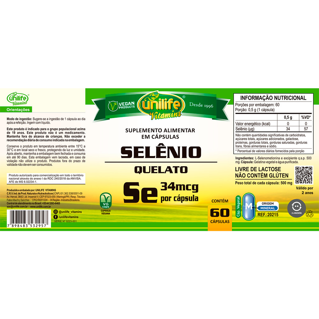 Selênio Quelato Unilife 60 Cápsulas
