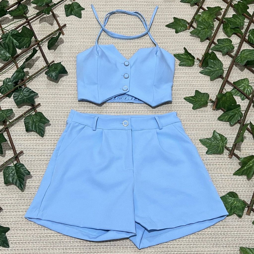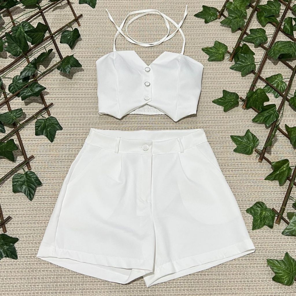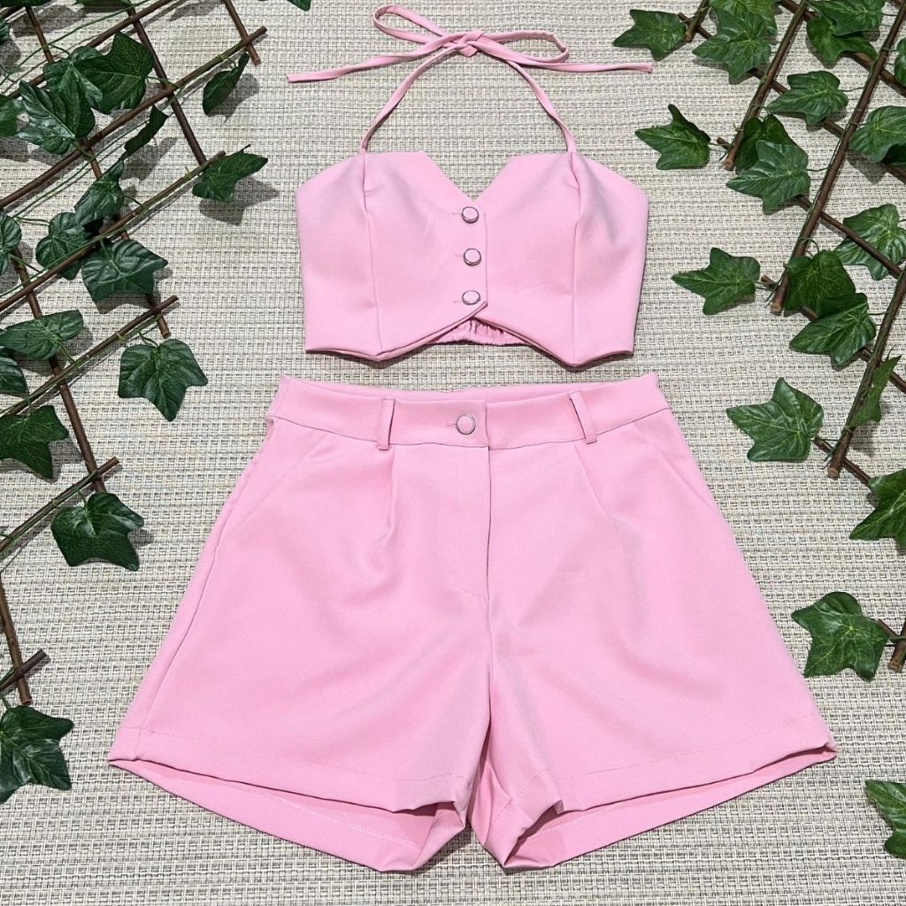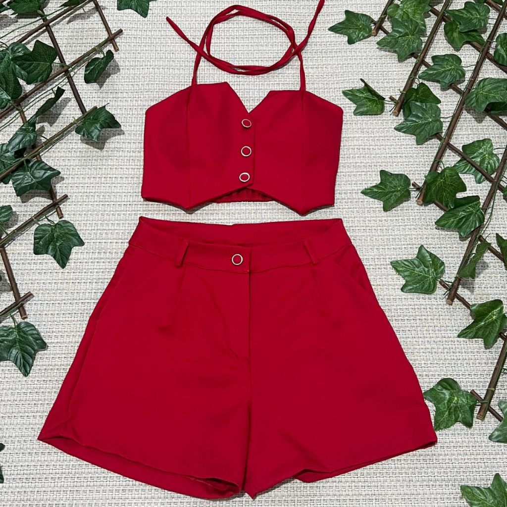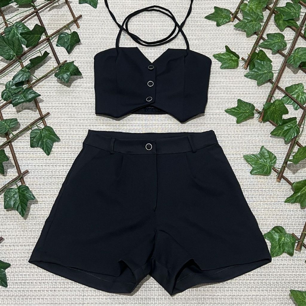 Conjunto feminino alfaiataria simples casual tecido cropped 3 botões com short diário moda verão