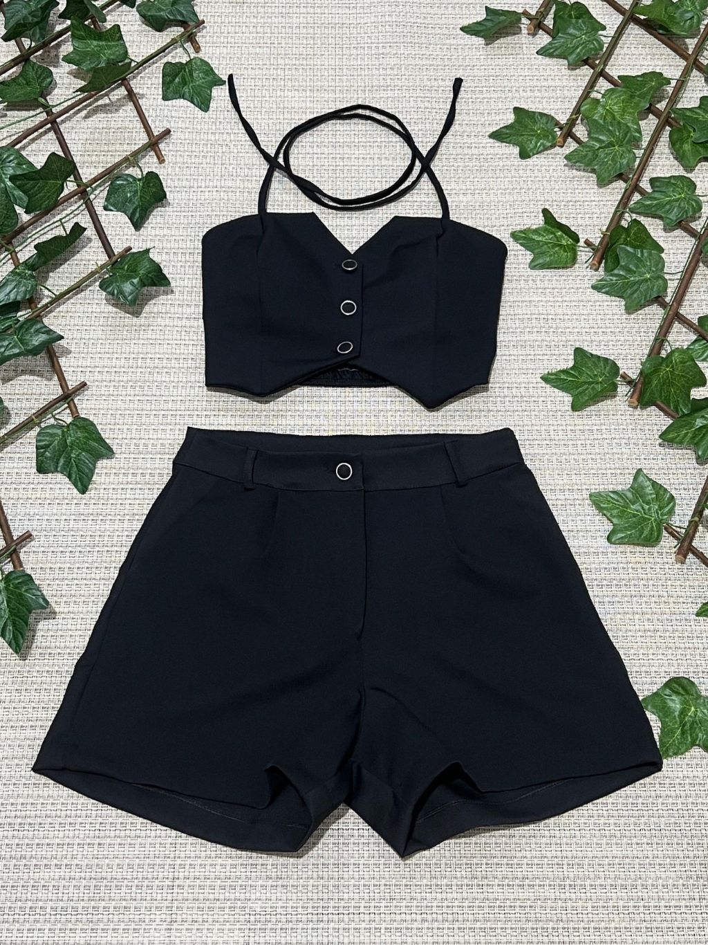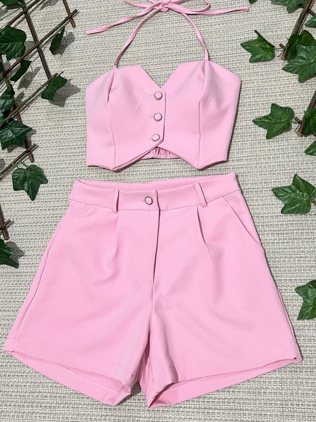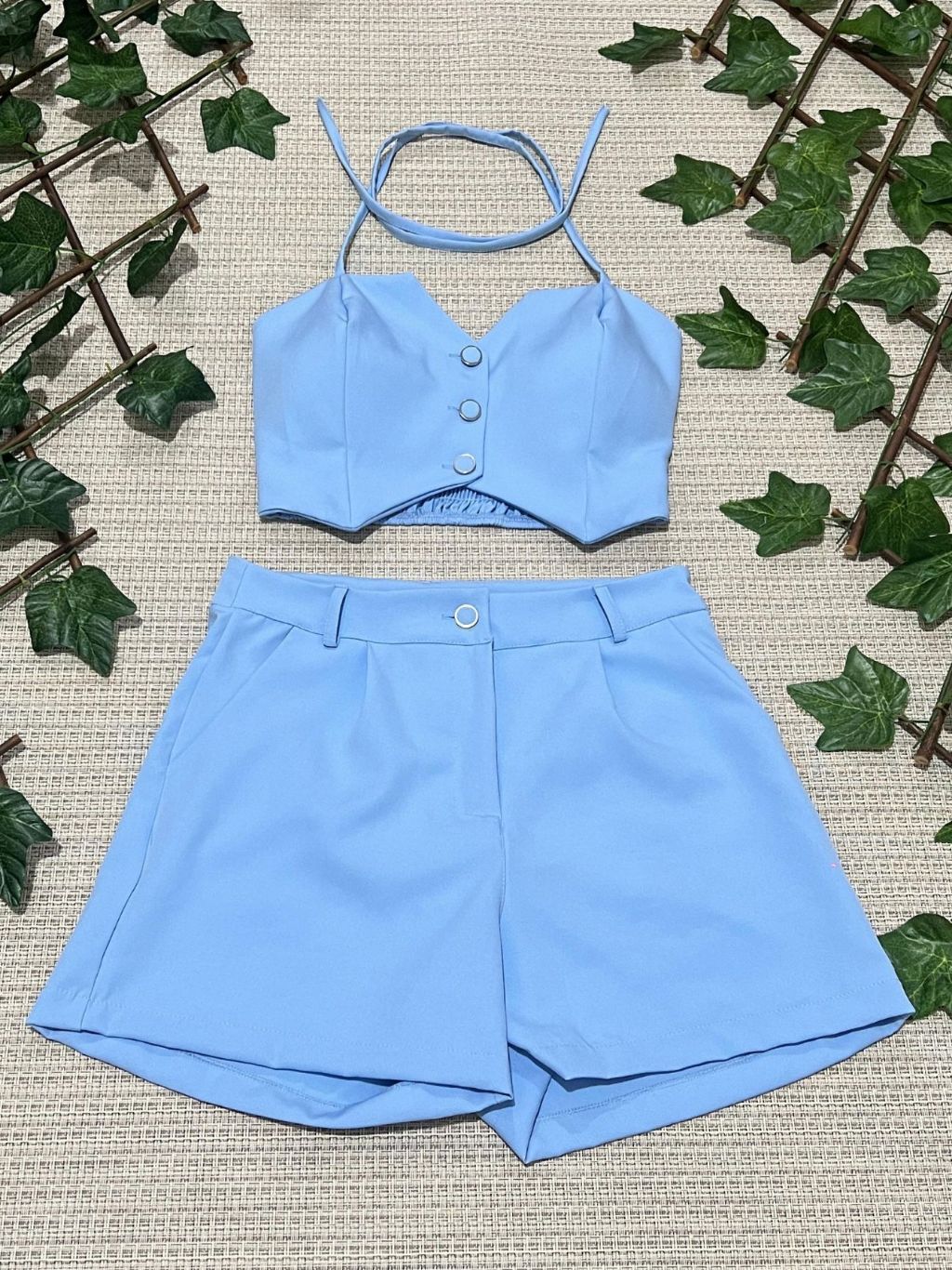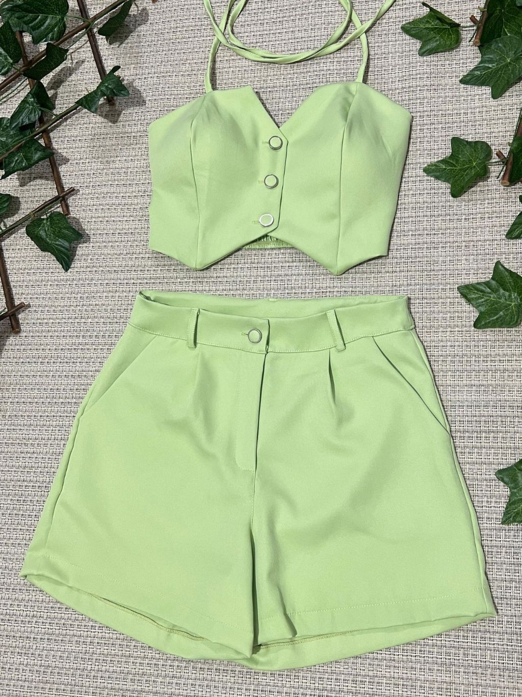 Conjunto feminino alfaiataria simples casual tecido cropped 3 botões com short diário moda verão