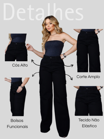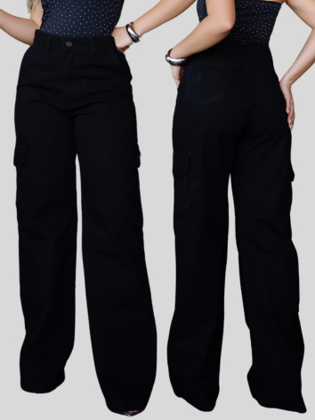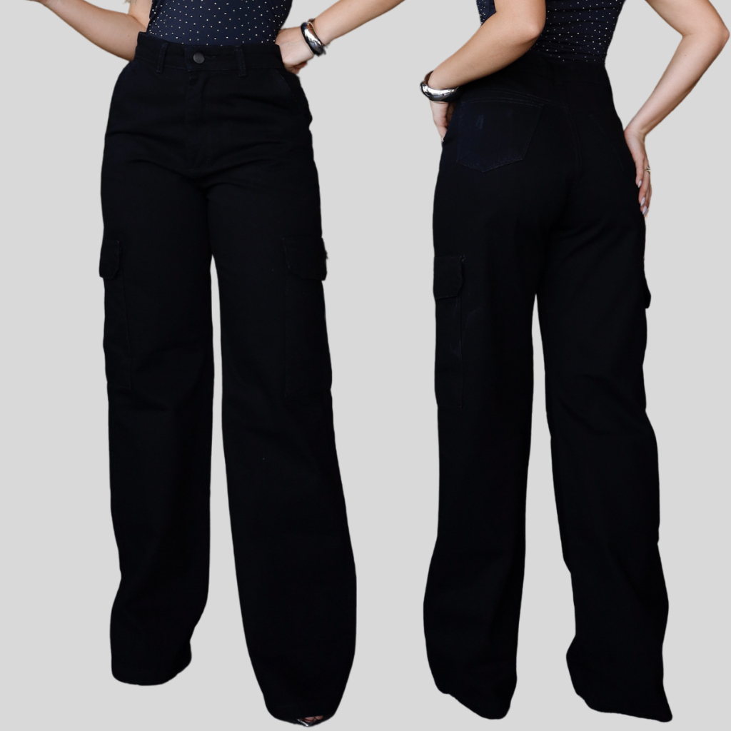 Calça Cargo Preta Jeans Wide Leg Feminina Pantalona
