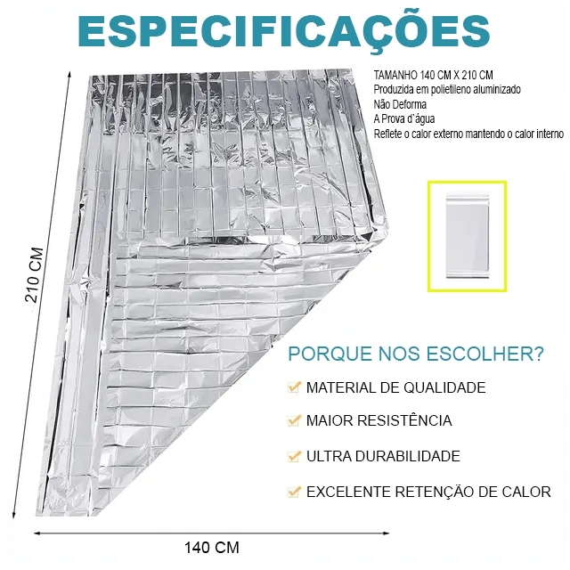 Cobertor Manta Térmica Aluminizado Para Resgate Emergência e Camping - KIT 2UN, 4UN, 6UN, 8UN, 10UN