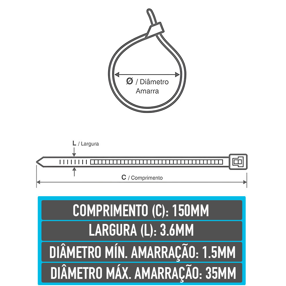 Pacote com 100 Abraçadeiras de Nylon Preta 150mm x 3.5mm T30R Hellermann 111-01045
