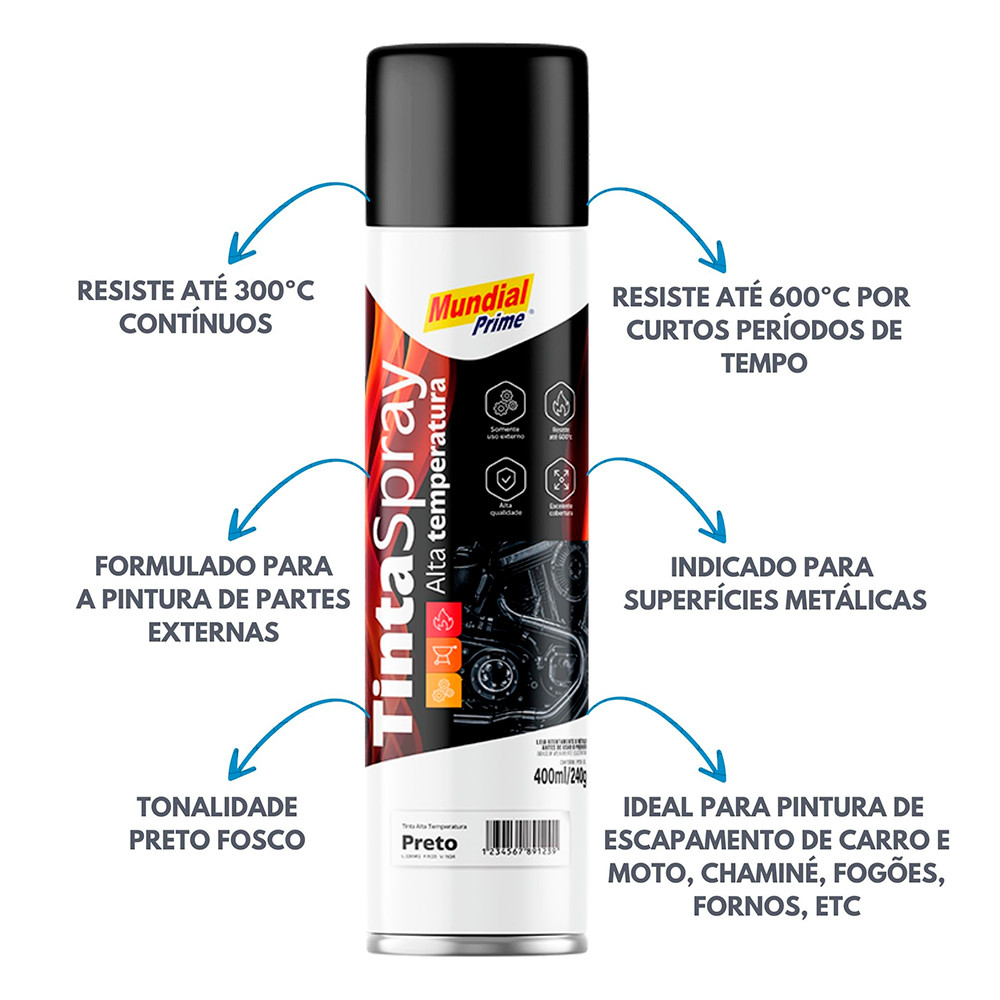 Tinta Spray Preto Fosco para Alta Temperatura 400ml Mundial Prime AE01000100