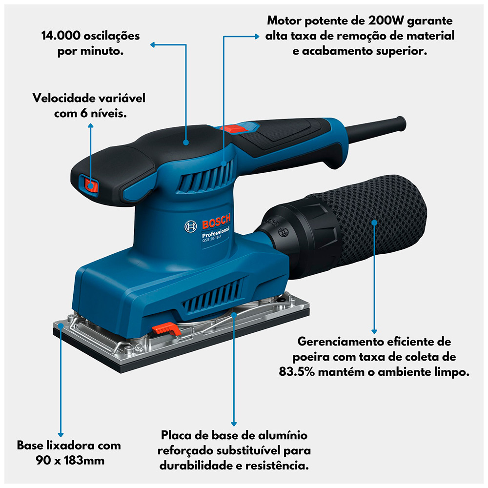 Lixadeira Orbital 200W com Coletor de Pó Bosch GSS 20-18A (220V)