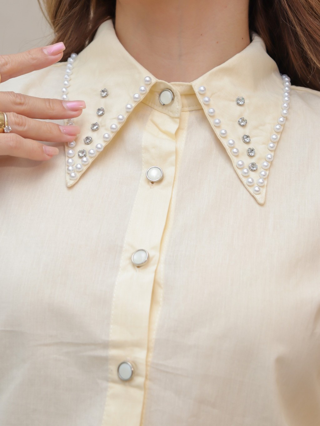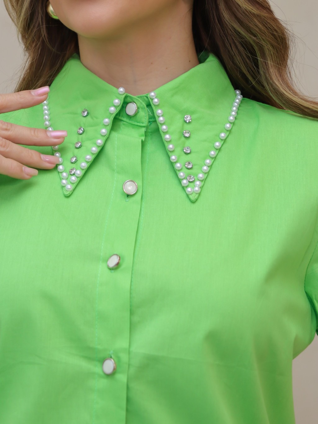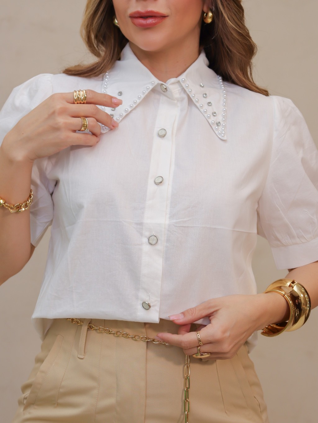 Camisa feminina algodão com gola com strass e botão,moda verão/E044
