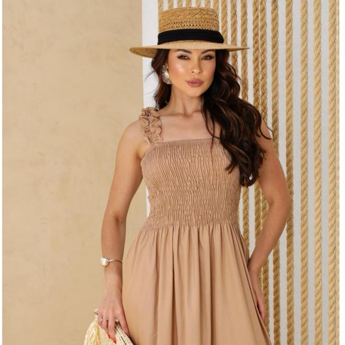 Vestido Longo Jeans Chambrey Leve Lastex Corpo Inteiro Alça Babado Moda Verão Versátil chic