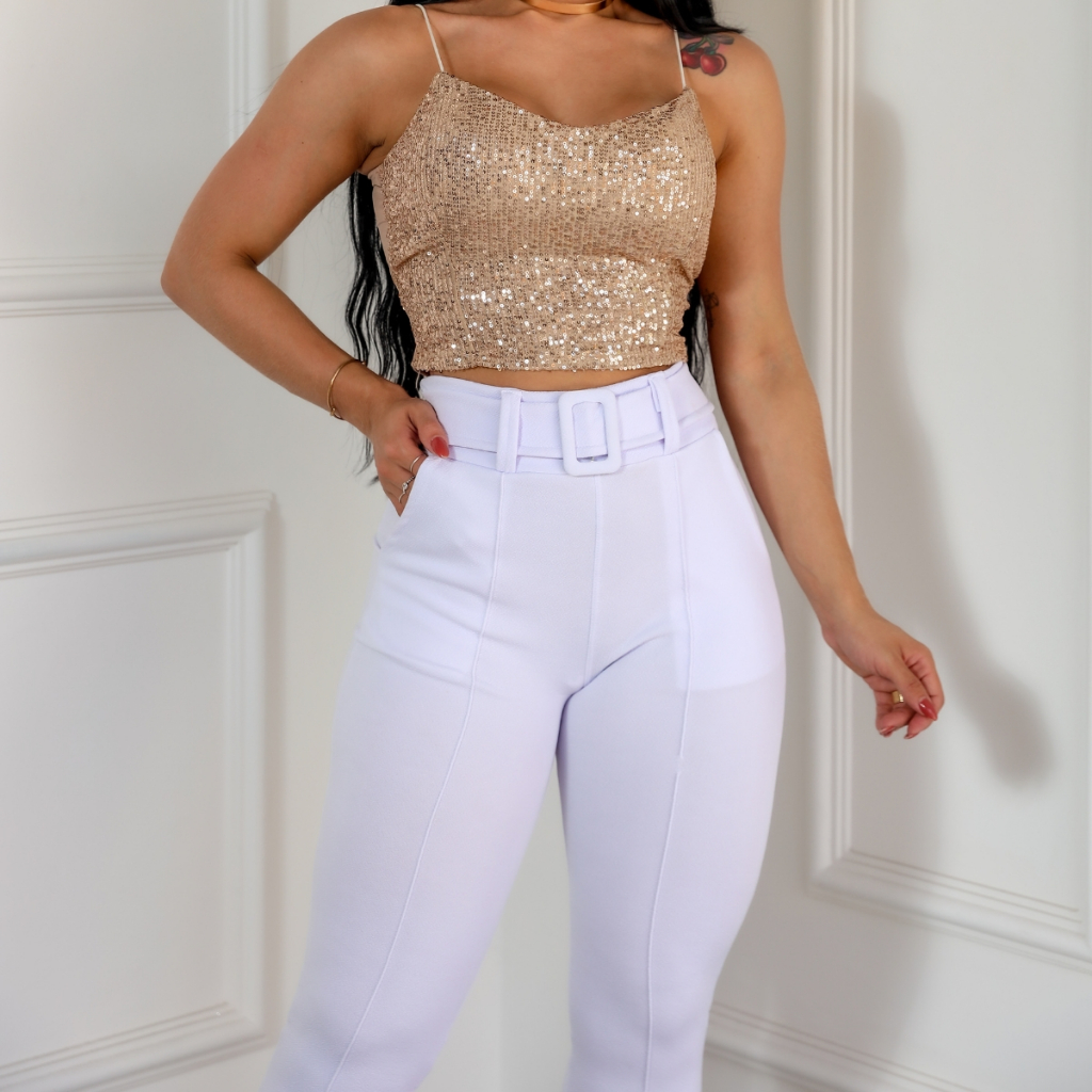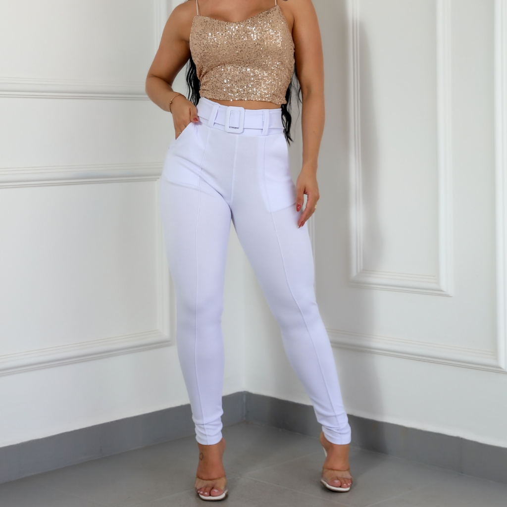 2 PEÇAS Calça Branca Feminina Skinny Malha Crepe Com Cinto Forrado Cintura Alta