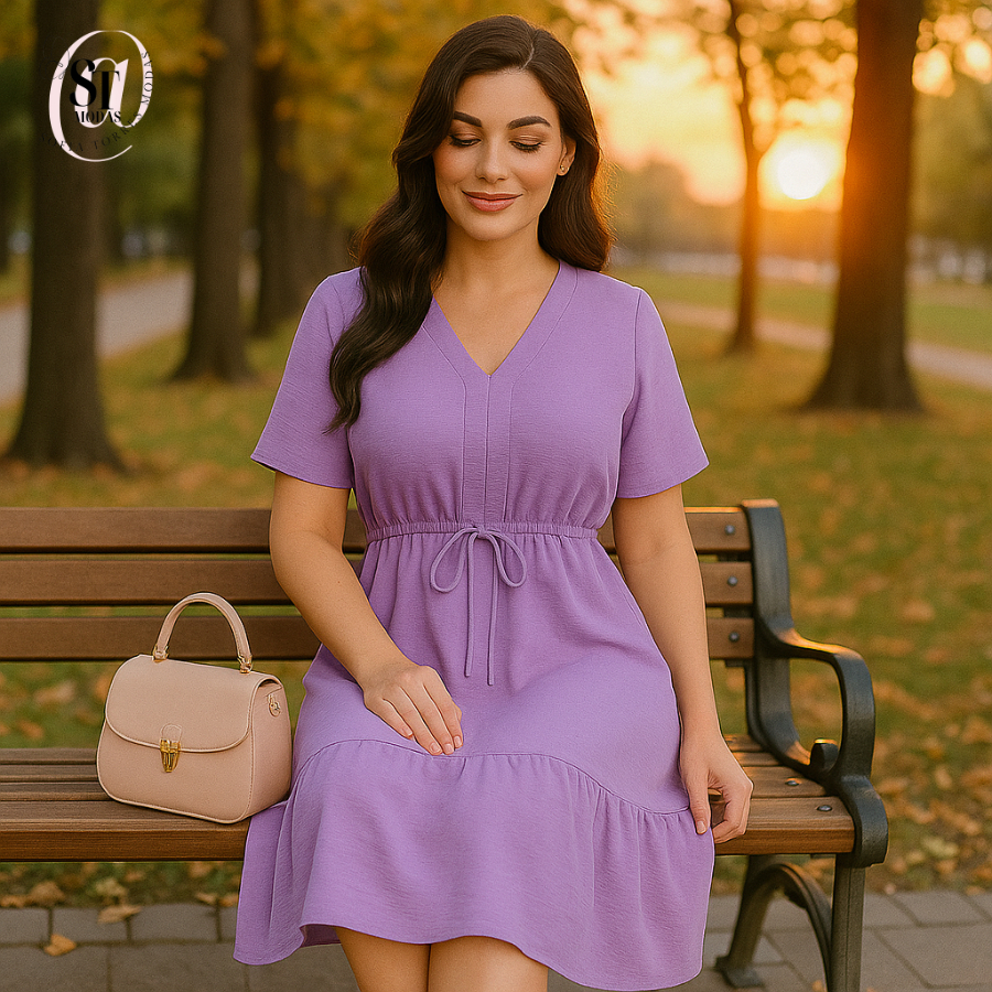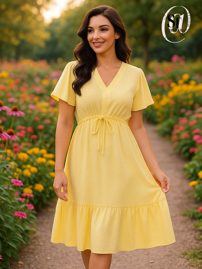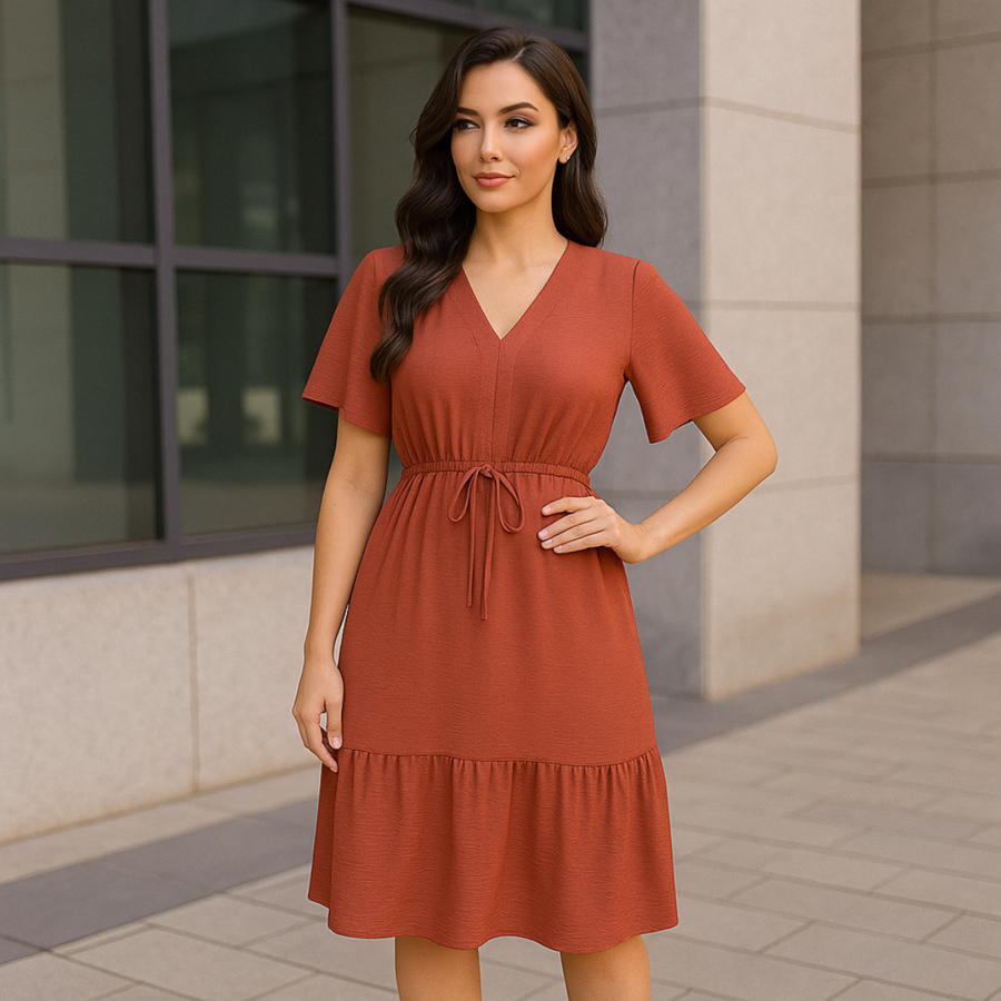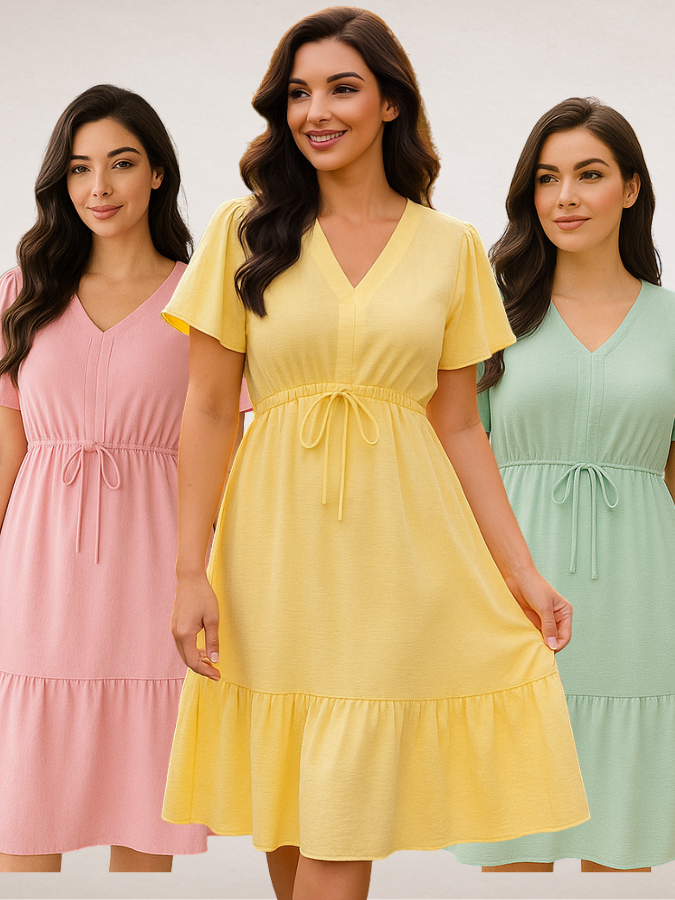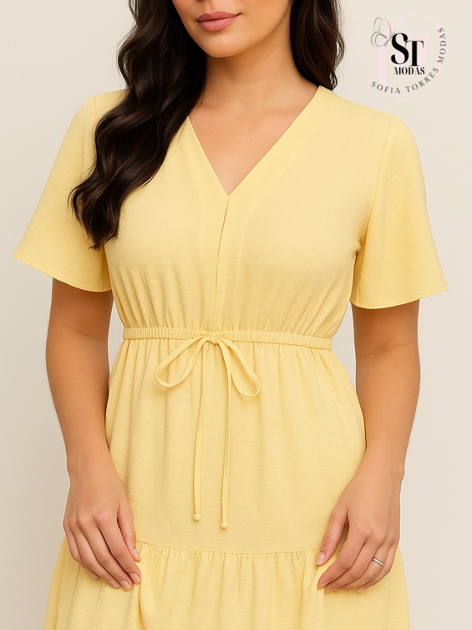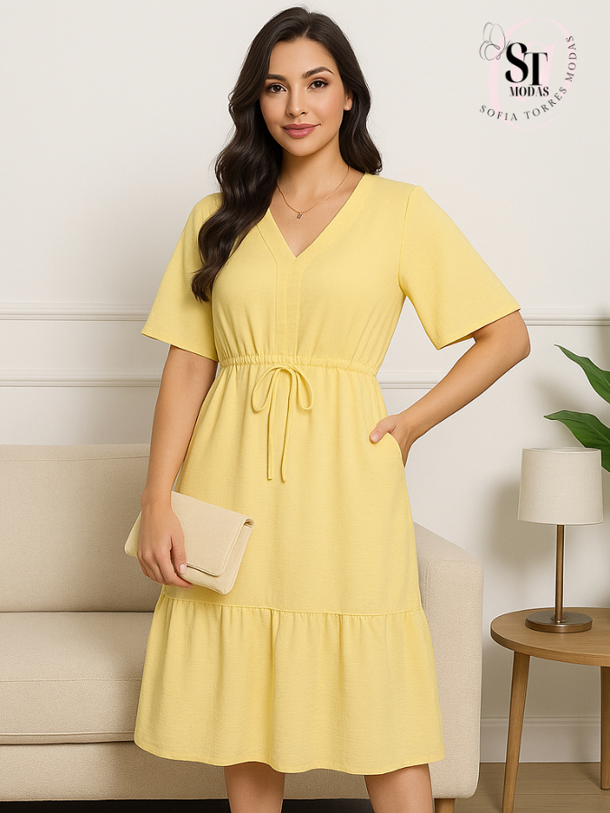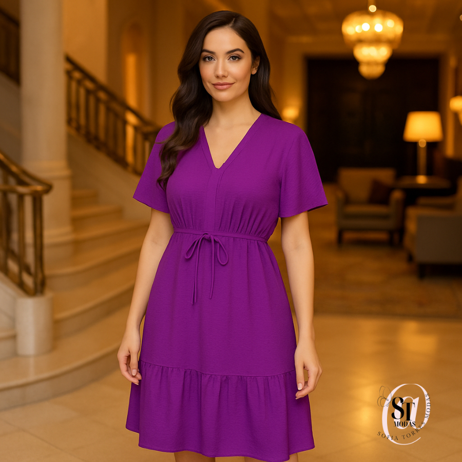 Vestido Feminino Curto Babado Casual Duna Manga Curta Midi Festa Moda Evangélica Elástico Cintura.