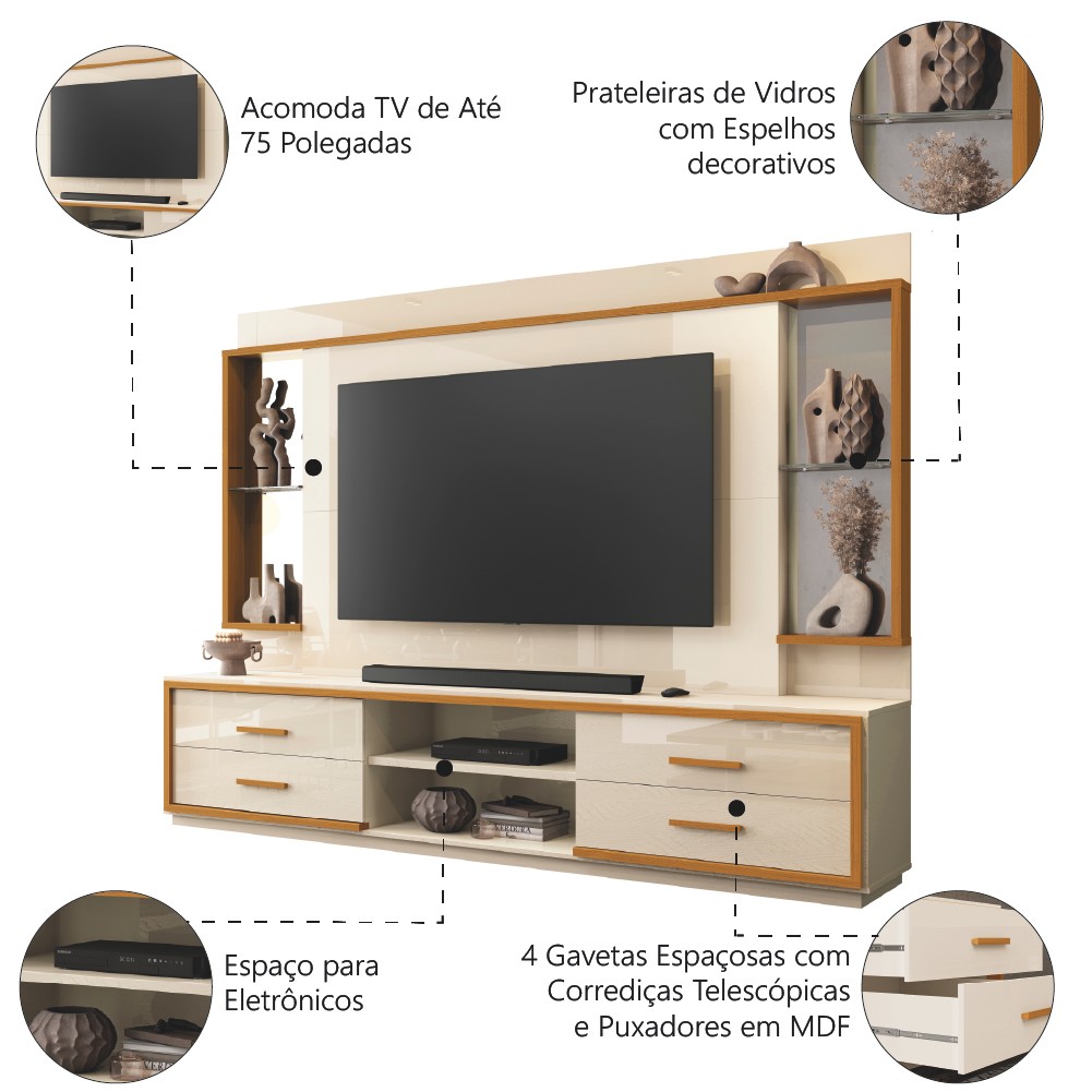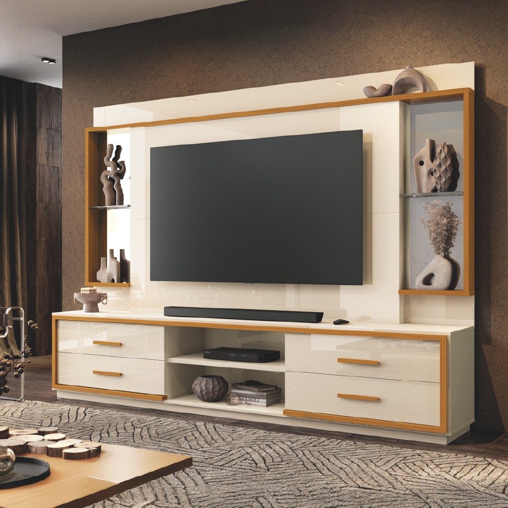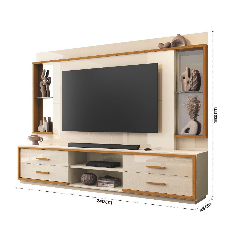 Estante Home Theater com Espelho e Vidro Para TV Até 75 Polegadas 2,40m Leni EDN