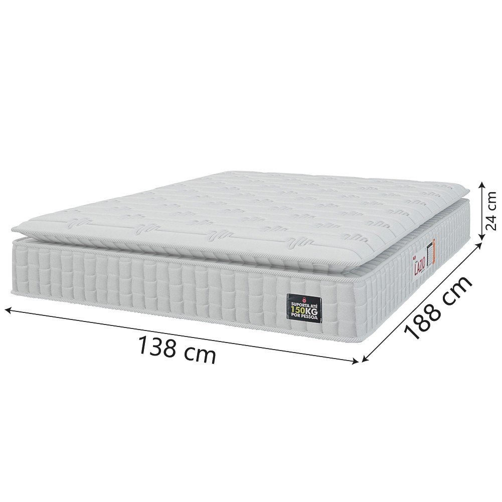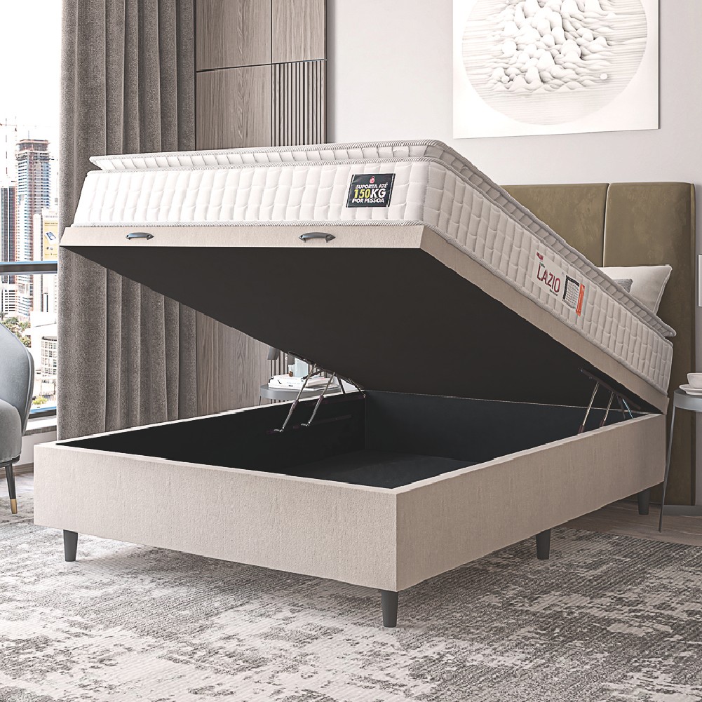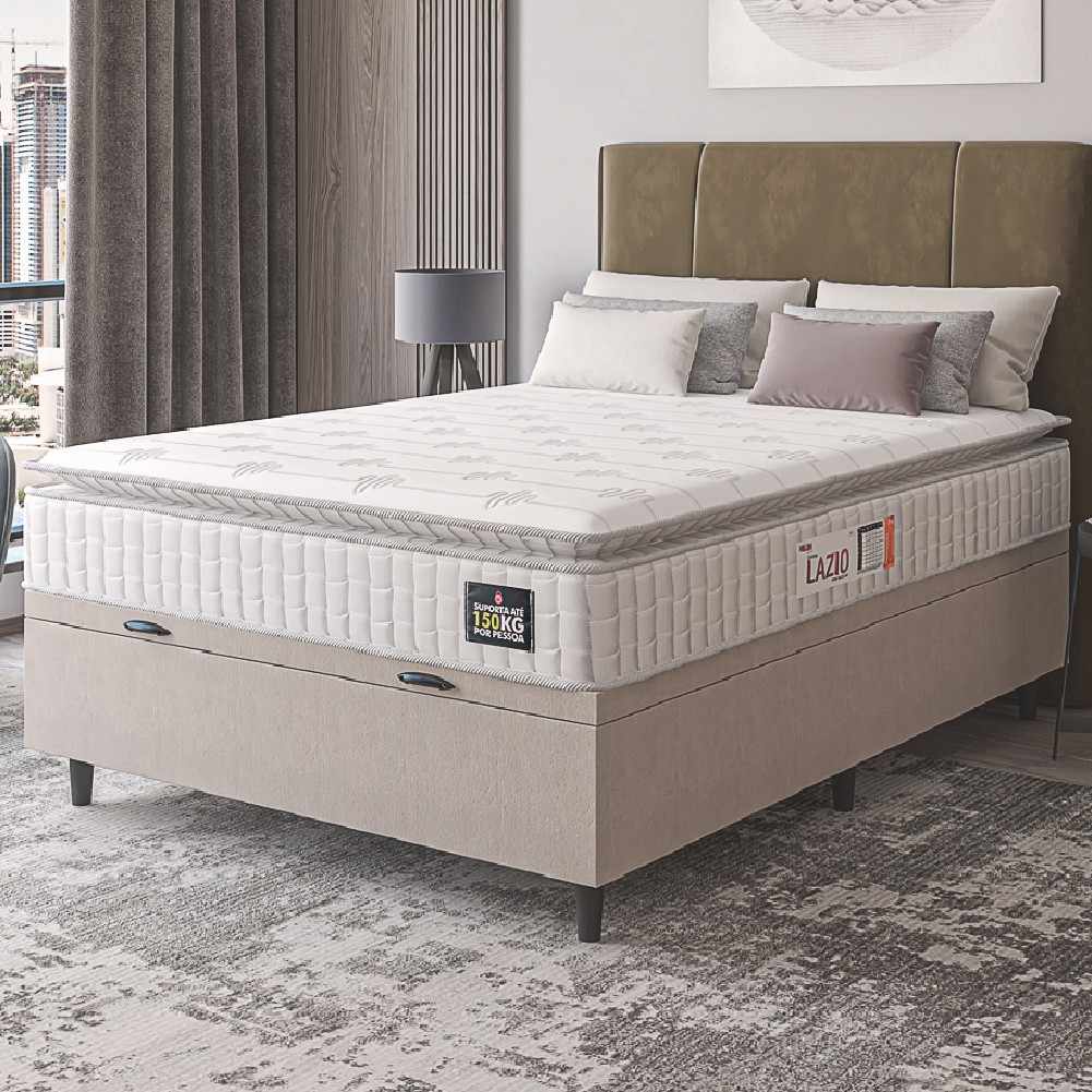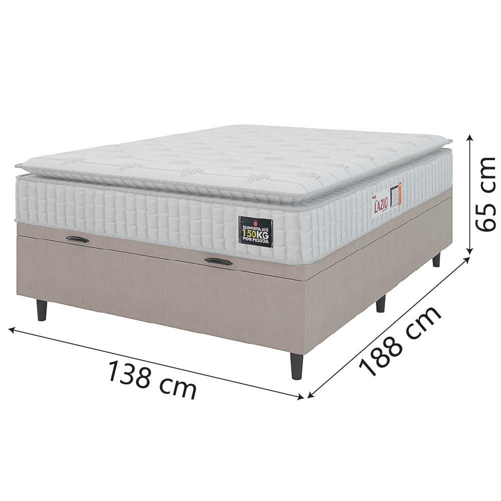 Cama Box Baú Casal Colchão Espuma D45 Lazio Pillow Top 138x188x65cm Suede Branco/Bege Hellen