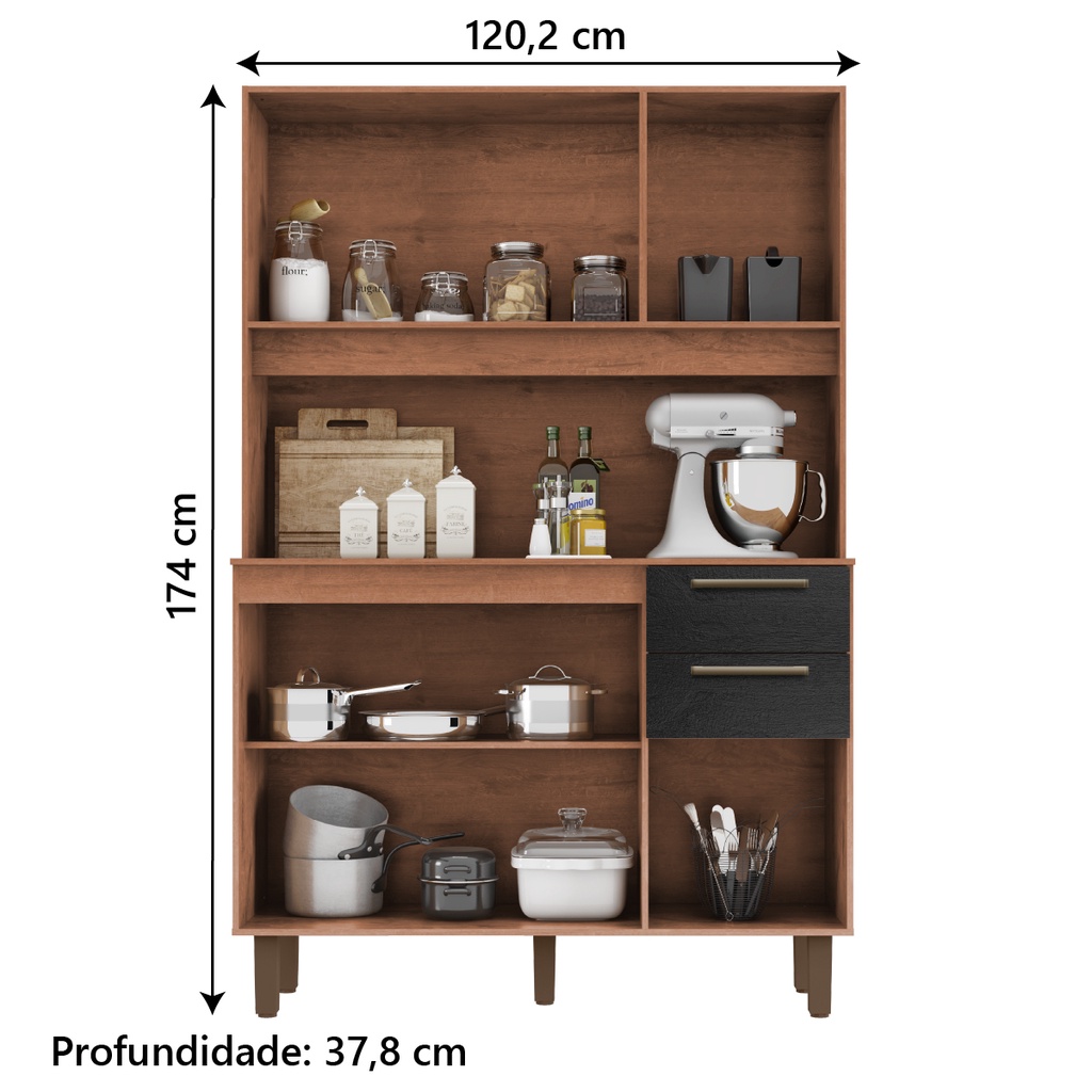 Armário de Cozinha Completa Compacta 6 Portas 2 Gavetas 1,20m Pop Nature / Preto Zanzini
