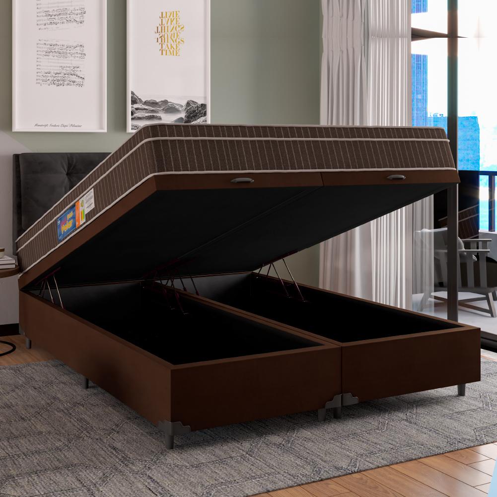 Cama Box Casal Queen Baú Colchão Espuma Orthoface Polar 158x198x66cm Branco/Marrom - Suporta Até 120kg Por Pessoa