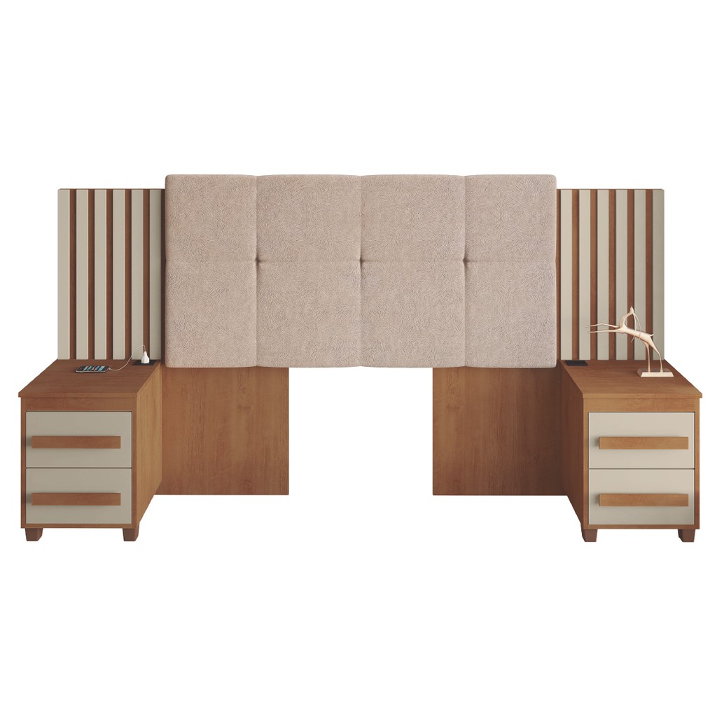 Cabeceira Casal Extensível com 2 Mesas de Apoio Ripado e Estofado Cinamomo/Off White Suíça RV Móveis