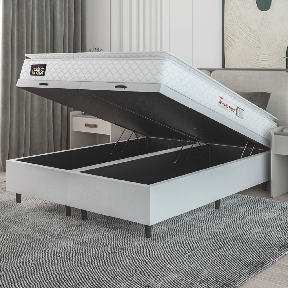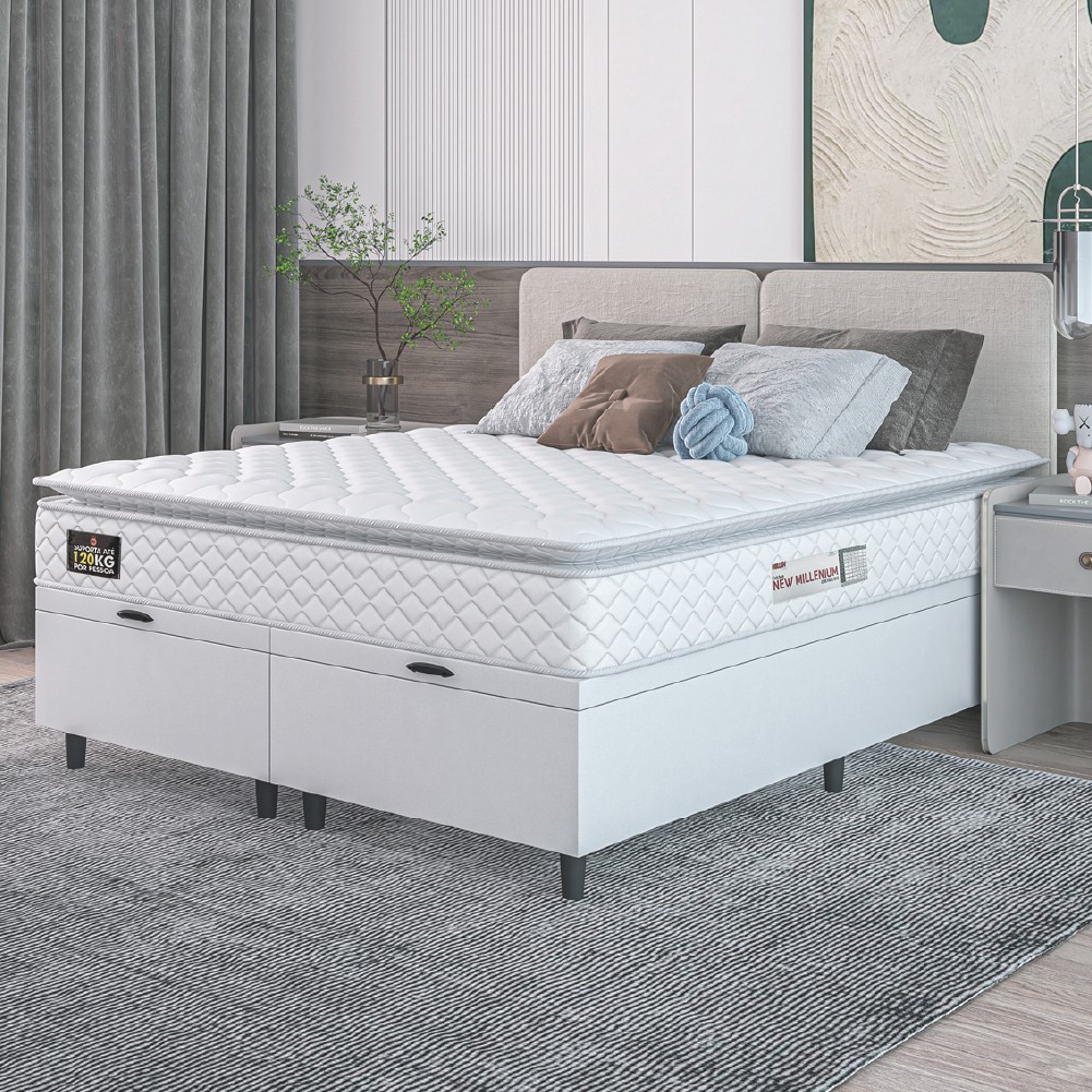 Cama Box Baú Casal Queen Colchão Espuma D33 Pillow Top New Millenium 158x198x60cm Bran Linho Hellen