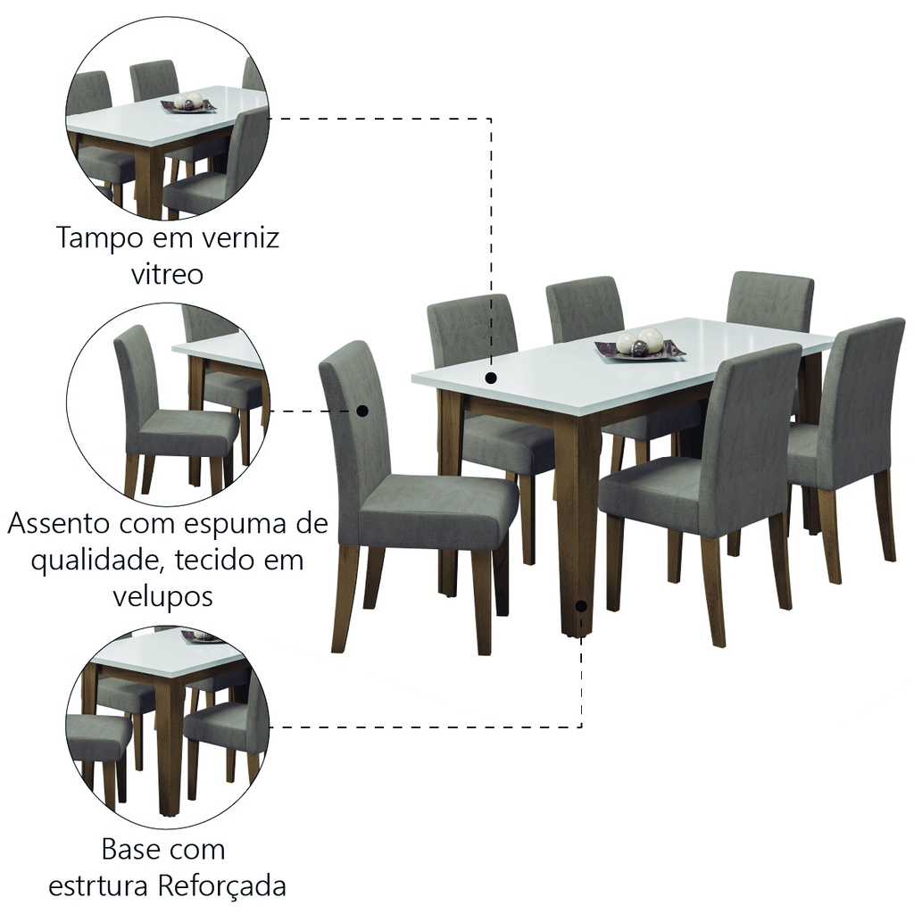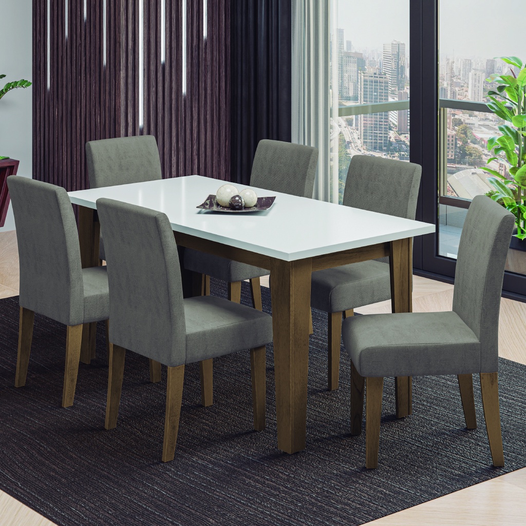 Conjunto de Mesa Sala de Jantar Miami com 6 Cadeiras Trieste Suede 1,60m Cedro / Off White / Mascavo