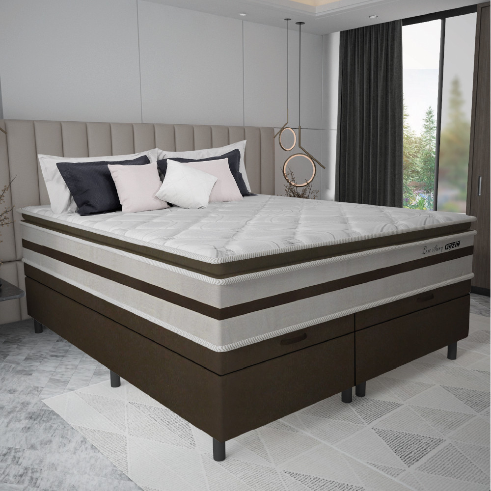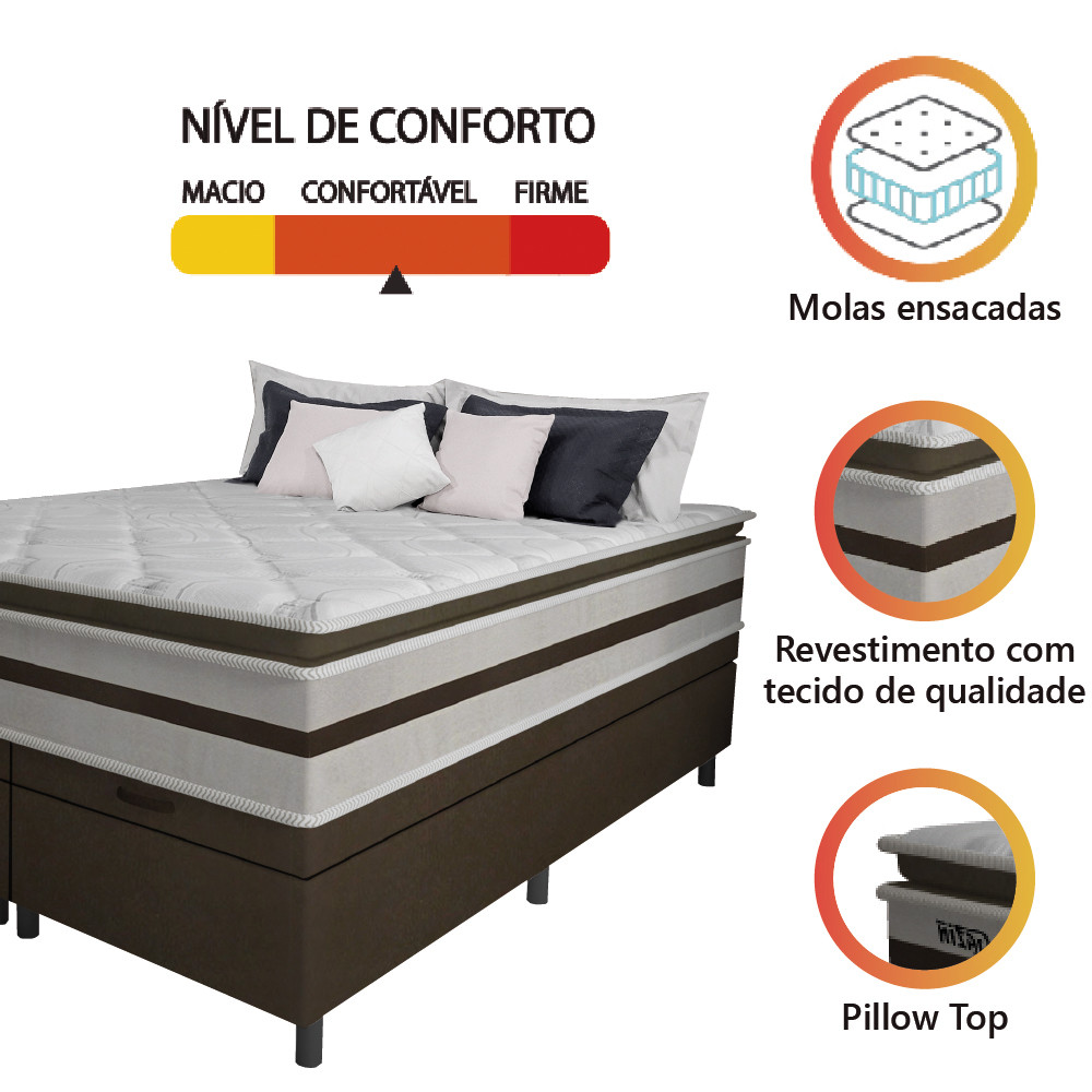 Cama Box Baú Casal King Colchão Molas Ensacadas Pillow Top Love Story 193x203x71cm Branco / Marrom