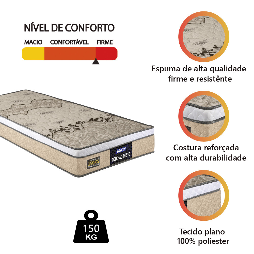 Colchão Solteiro Espuma D33 Fort Gazin 88x188x21cm Bege/Branco - Suporta até 150kg por Pessoa