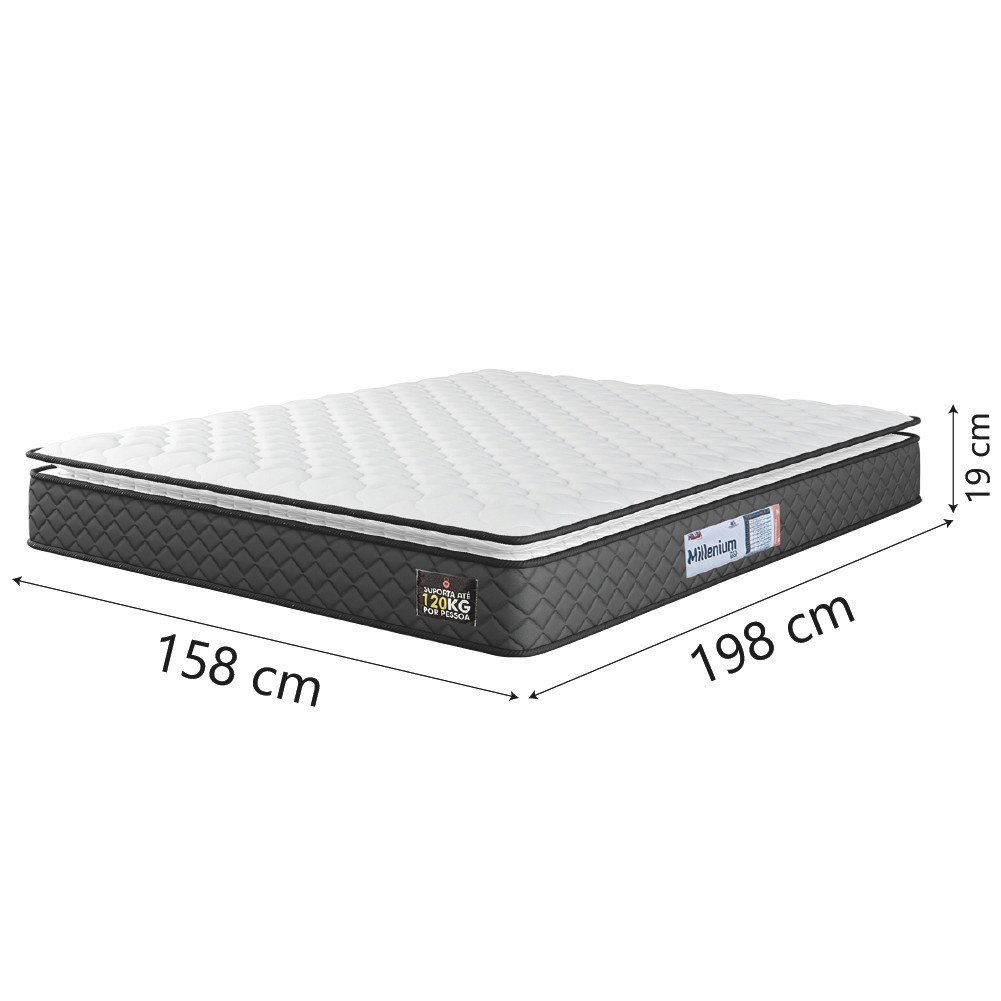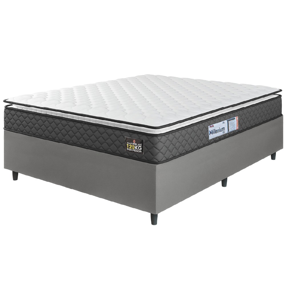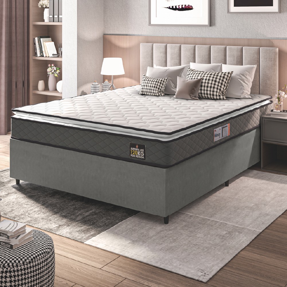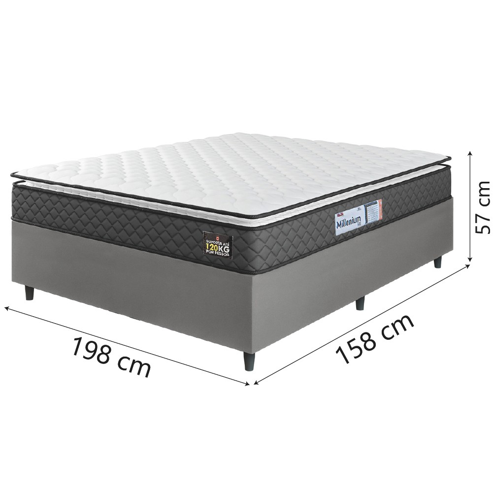 Cama Box Casal Queen Colchão Espuma D33 Pillow Top Millenium 158x198x57cm Suede Cinza/Branco Hellen