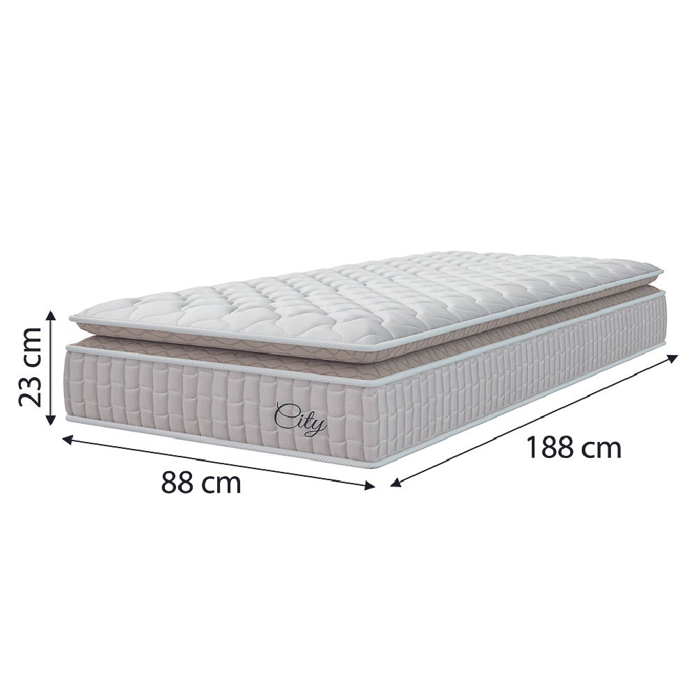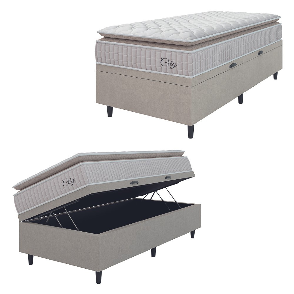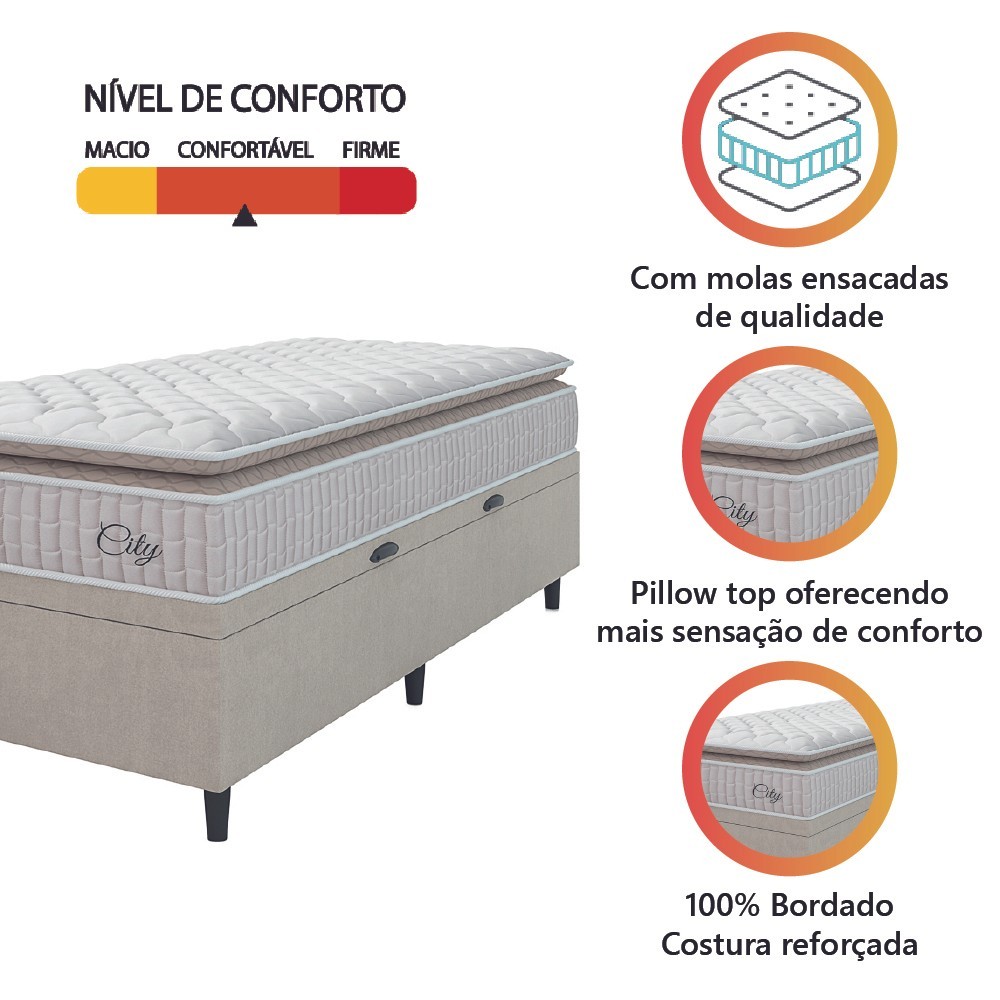 Cama Box Baú Colchão Solteiro Molas Ensacadas City Pillow Top 88x188x64cm Branco / Bege Hellen