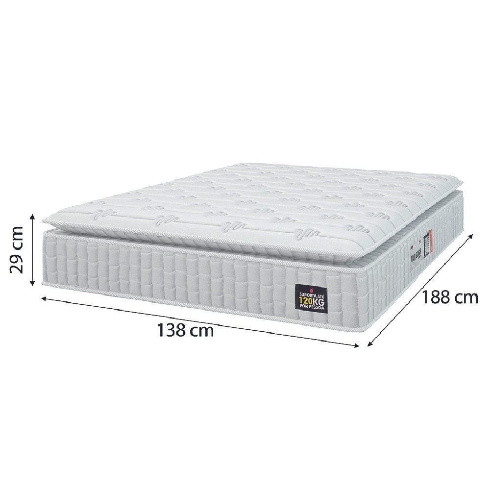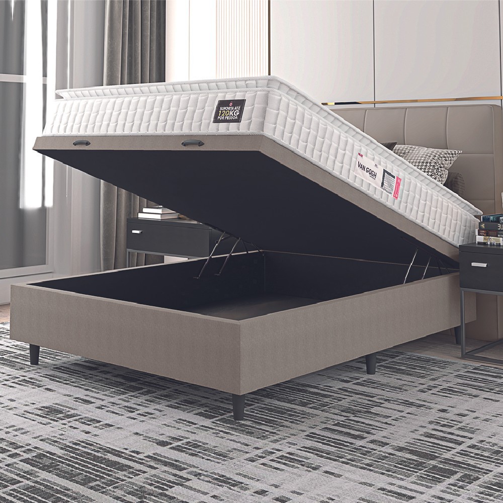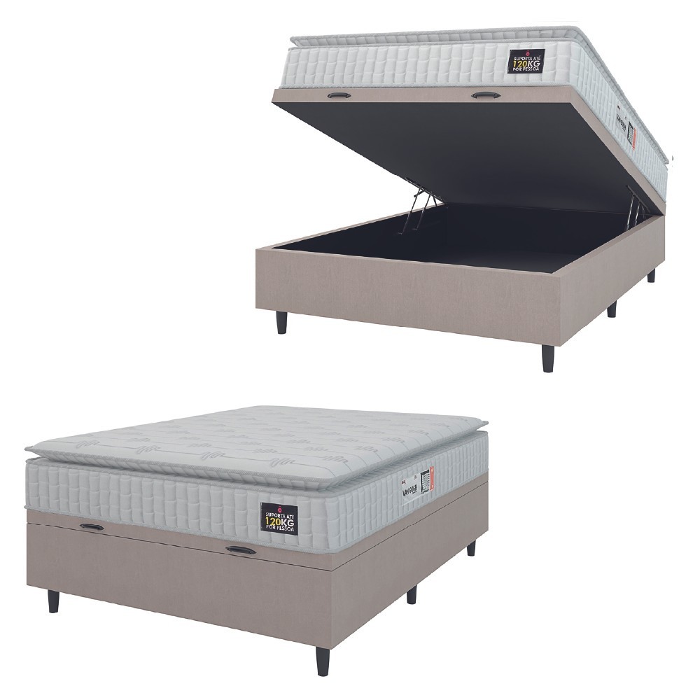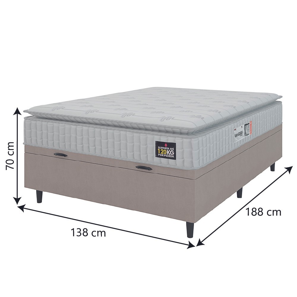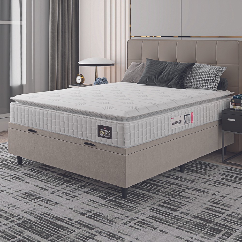 Cama Box Baú Colchão Casal Espuma D33 Vangogh Pillow Top 138x188x70cm Branco / Bege Hellen