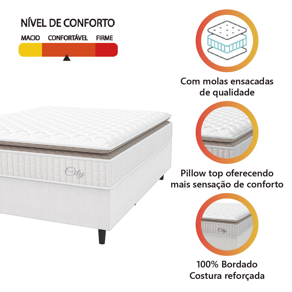 Cama Box Colchão Casal Molas Ensacadas City Pillow Top 138x188x61cm Linho Branco / Bege Hellen
